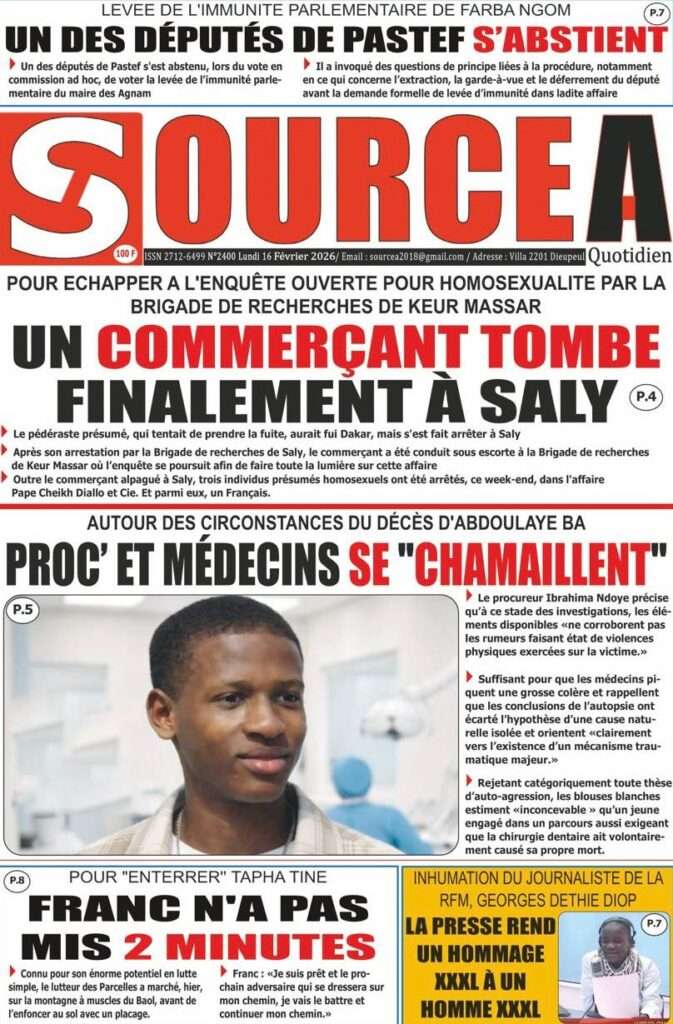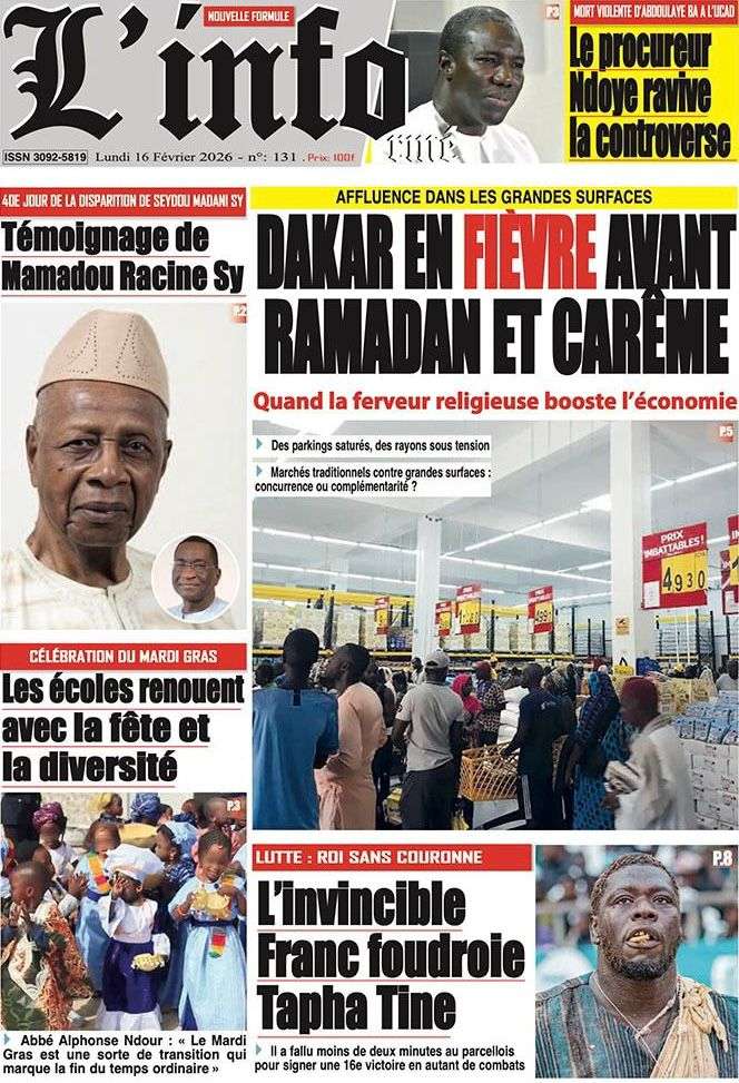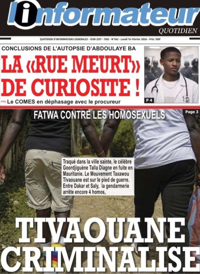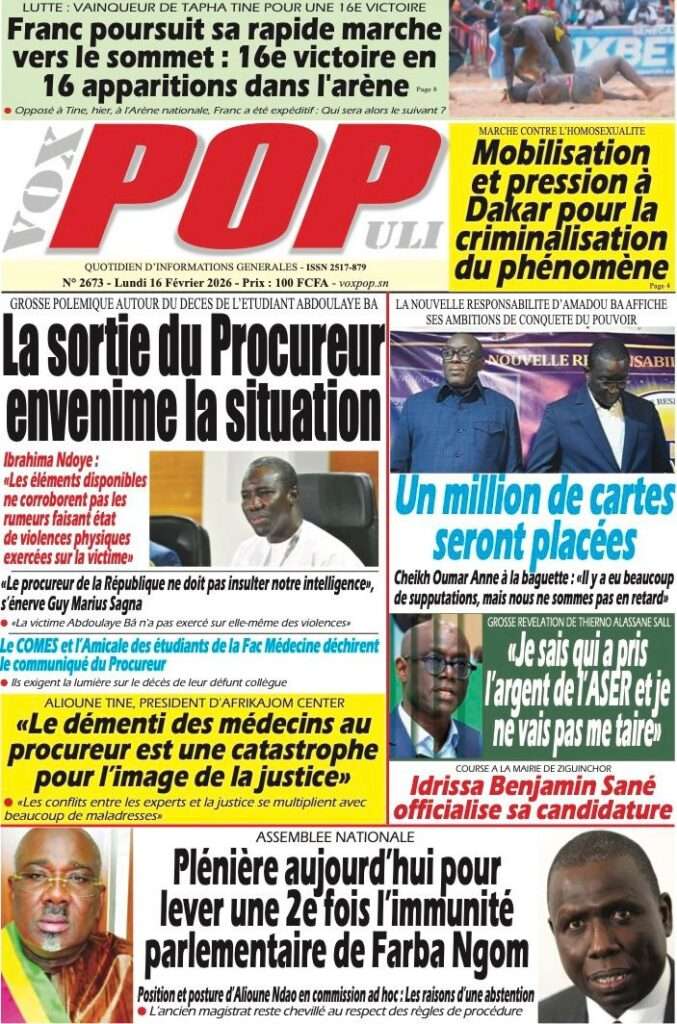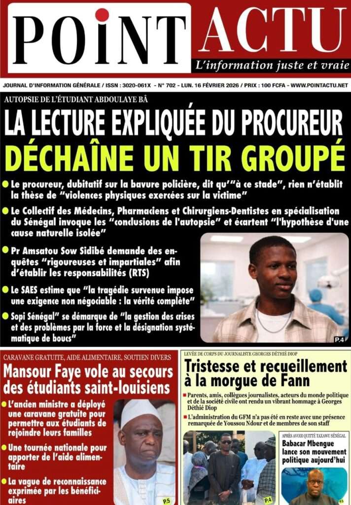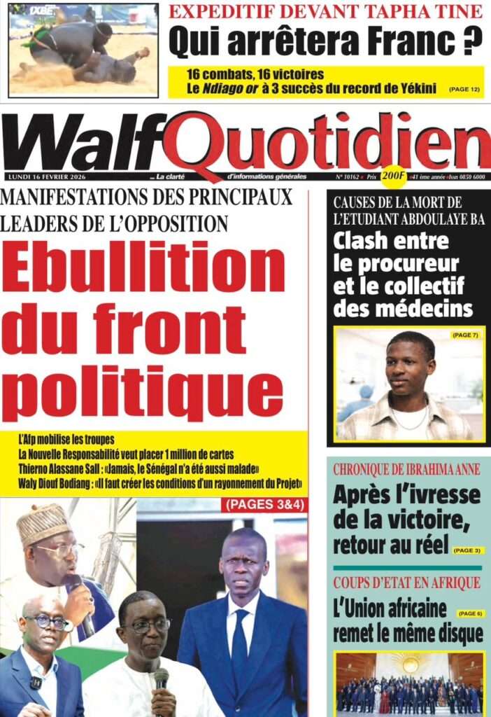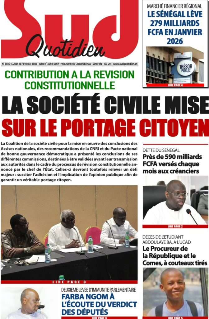 A la Une La Une Des Quotidiens – Lundi 16 Février 2026 (Avec Ma Revue De Presse) Bour Sine février 16, 2026 0 Post navigation Previous: REFONDATION DU SYSTÈME ÉDUCATIF : OSER ENFIN LA RÉFORME DE LA SÉLECTION DES ÉLITES (PAR SOREU MALICK DIOP)Next: Session chargée à l’Assemblée : trois jours pour trancher sur l’immunité, l’armée et les médias More Stories A la Une Actualité Politique Ce que change la nouvelle loi électorale adoptée par les députés Bour Sine avril 28, 2026 0 A la Une Actualité Politique « Ensemble, nous sommes une force »Par Hamidou Thiaw, Président du MPR Bour Sine avril 28, 2026 0 A la Une Actualité Pape Malick Ndour envoyé en prison Bour Sine avril 28, 2026 0 Laisser un commentaire Annuler la réponseVotre adresse e-mail ne sera pas publiée. Les champs obligatoires sont indiqués avec *Commentaire * Nom * E-mail * Site web Enregistrer mon nom, mon e-mail et mon site dans le navigateur pour mon prochain commentaire.