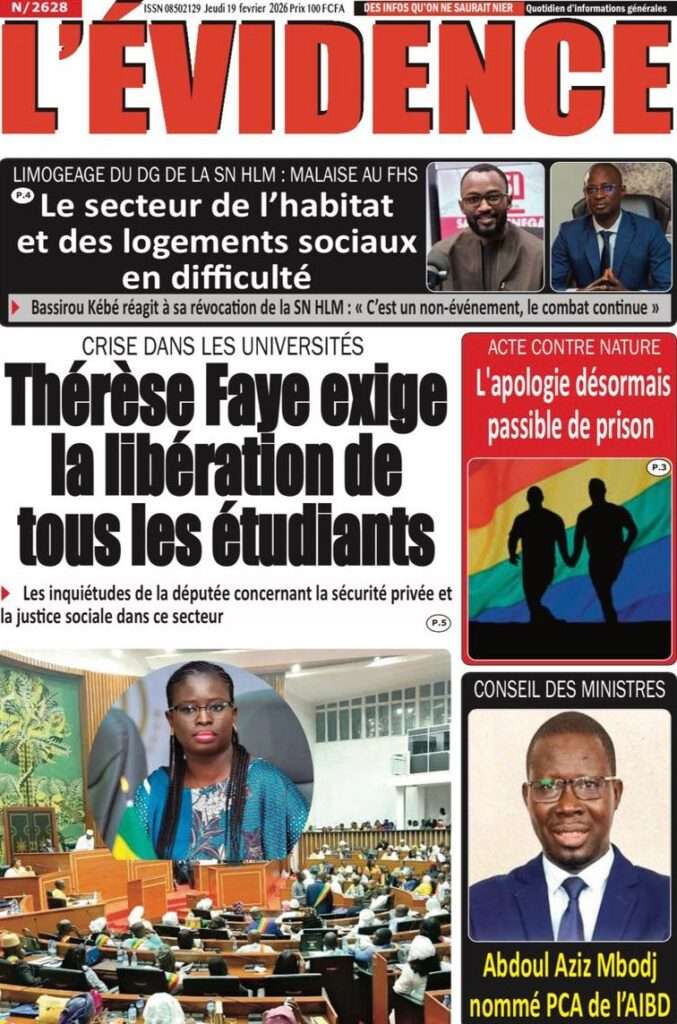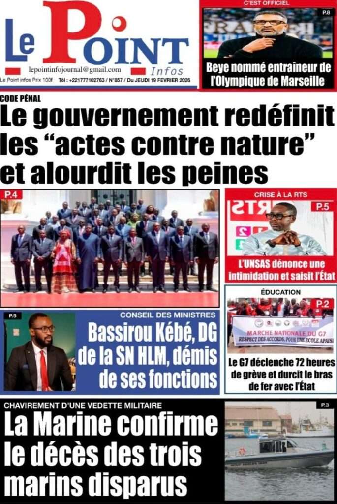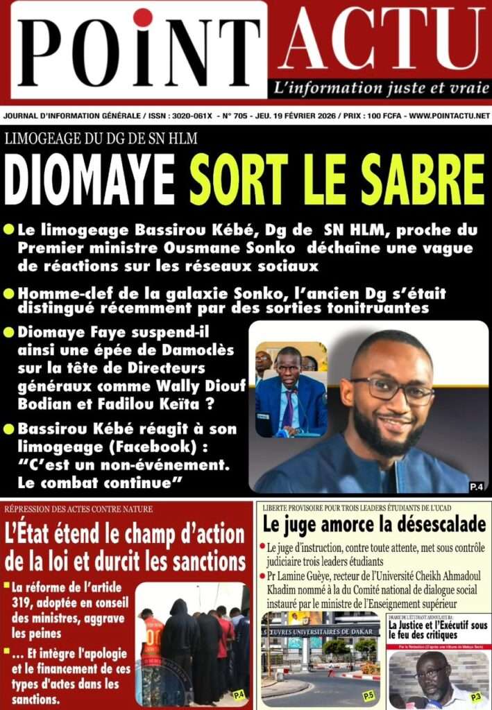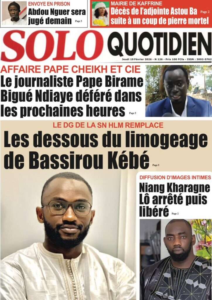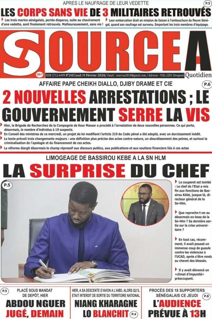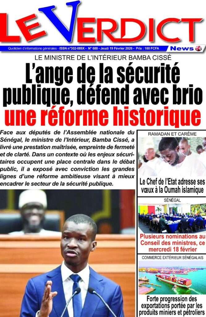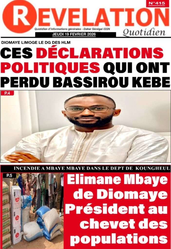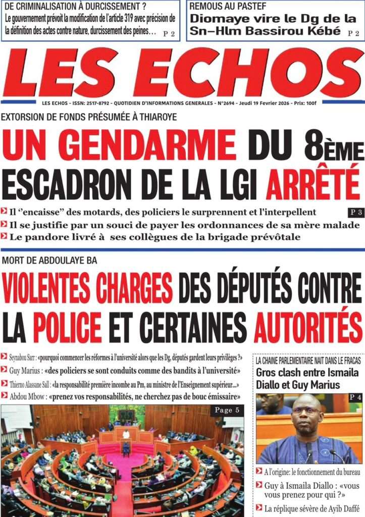 A la Une Actualité La Une Des Quotidiens – Jeudi 19 Février 2026 (Avec Ma Revue De Presse) Bour Sine février 19, 2026 0 Post navigation Previous: Communiqué du Conseil des ministres du mercredi 18 février 2026Next: ÉPHÉMÉRIDES DU 19 FÉVRIER More Stories A la Une Actualité Politique Ce que change la nouvelle loi électorale adoptée par les députés Bour Sine avril 28, 2026 0 A la Une Actualité Politique « Ensemble, nous sommes une force »Par Hamidou Thiaw, Président du MPR Bour Sine avril 28, 2026 0 A la Une Actualité Pape Malick Ndour envoyé en prison Bour Sine avril 28, 2026 0 Laisser un commentaire Annuler la réponseVotre adresse e-mail ne sera pas publiée. Les champs obligatoires sont indiqués avec *Commentaire * Nom * E-mail * Site web Enregistrer mon nom, mon e-mail et mon site dans le navigateur pour mon prochain commentaire.