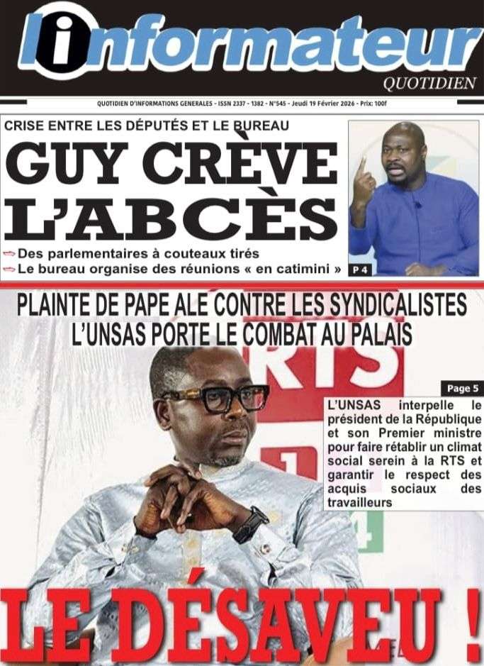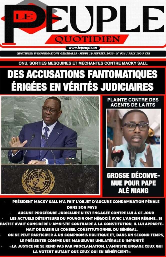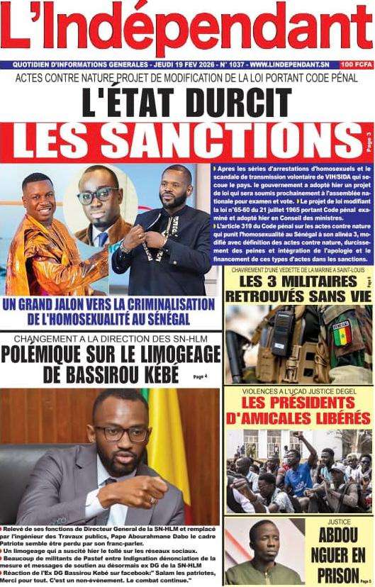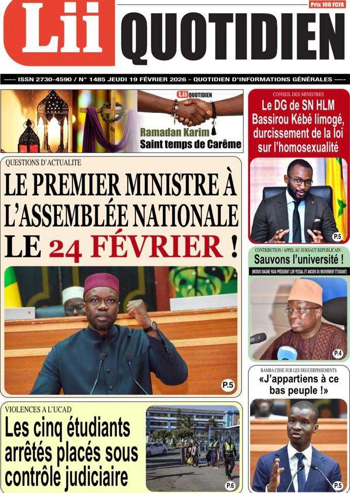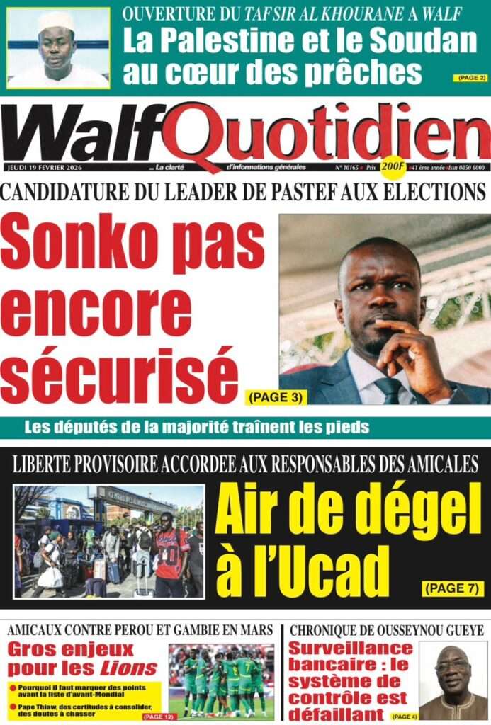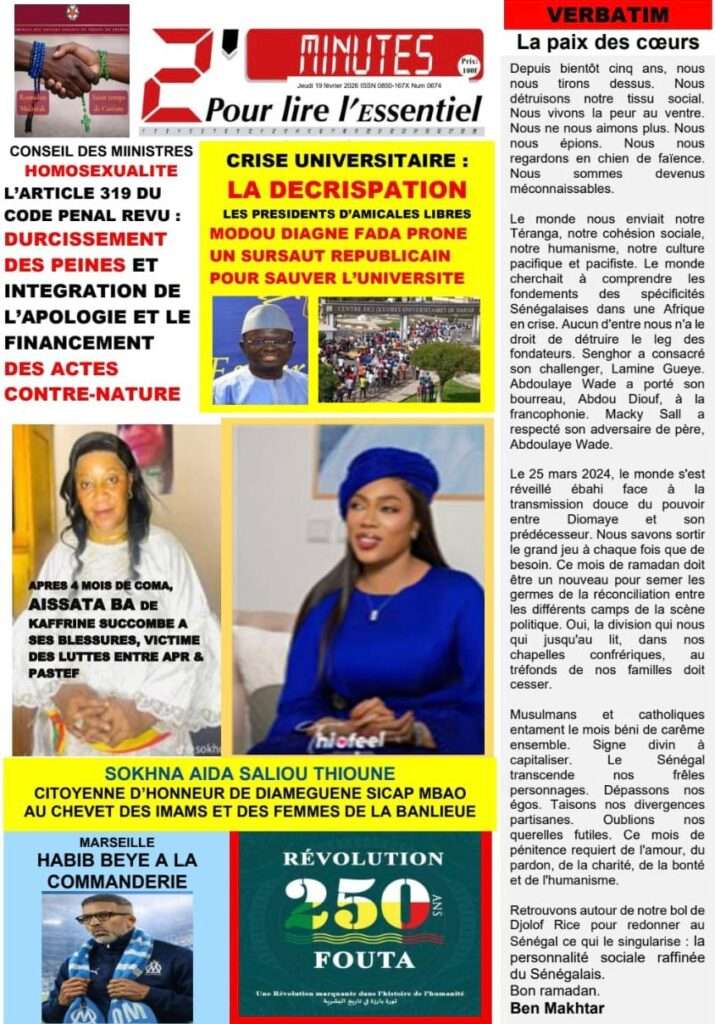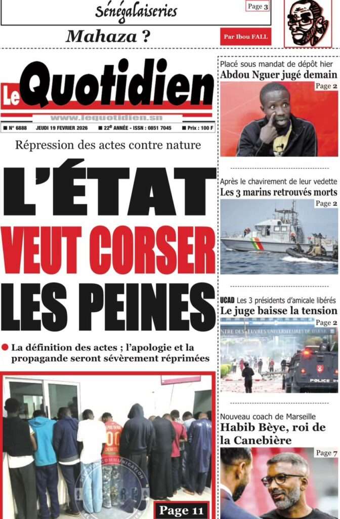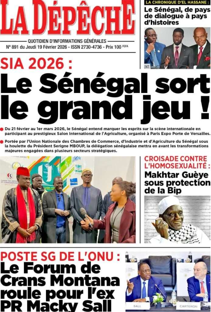 A la Une Actualité La Une Des Quotidiens – Jeudi 19 Février 2026 (Avec Ma Revue De Presse) Bour Sine février 19, 2026 0 Post navigation Previous: Communiqué du Conseil des ministres du mercredi 18 février 2026Next: ÉPHÉMÉRIDES DU 19 FÉVRIER More Stories A la Une Actualité Politique Ce que change la nouvelle loi électorale adoptée par les députés Bour Sine avril 28, 2026 0 A la Une Actualité Politique « Ensemble, nous sommes une force »Par Hamidou Thiaw, Président du MPR Bour Sine avril 28, 2026 0 A la Une Actualité Pape Malick Ndour envoyé en prison Bour Sine avril 28, 2026 0 Laisser un commentaire Annuler la réponseVotre adresse e-mail ne sera pas publiée. Les champs obligatoires sont indiqués avec *Commentaire * Nom * E-mail * Site web Enregistrer mon nom, mon e-mail et mon site dans le navigateur pour mon prochain commentaire.