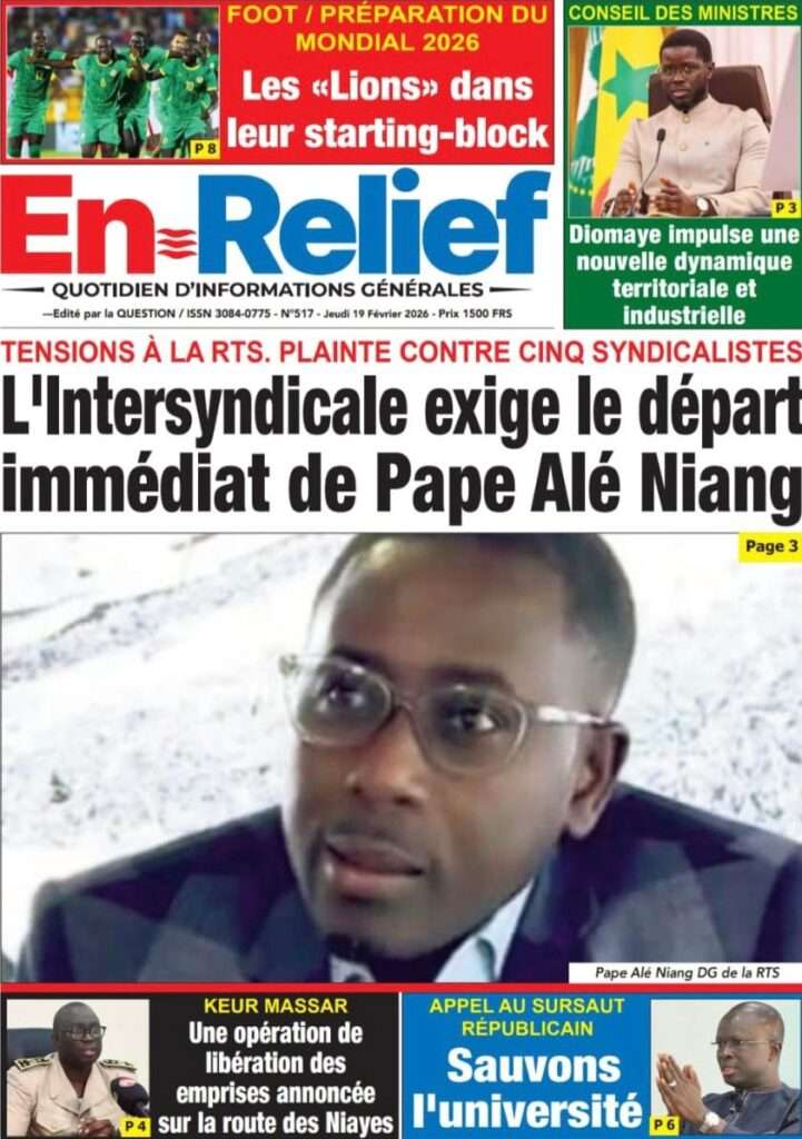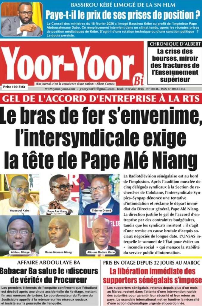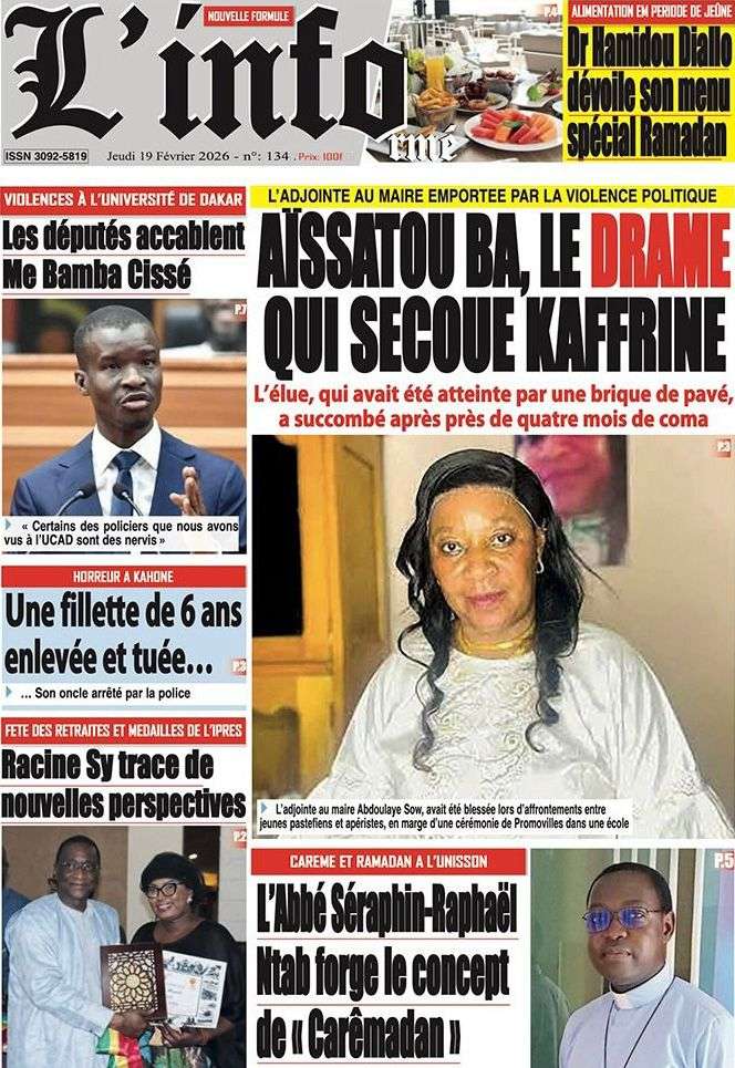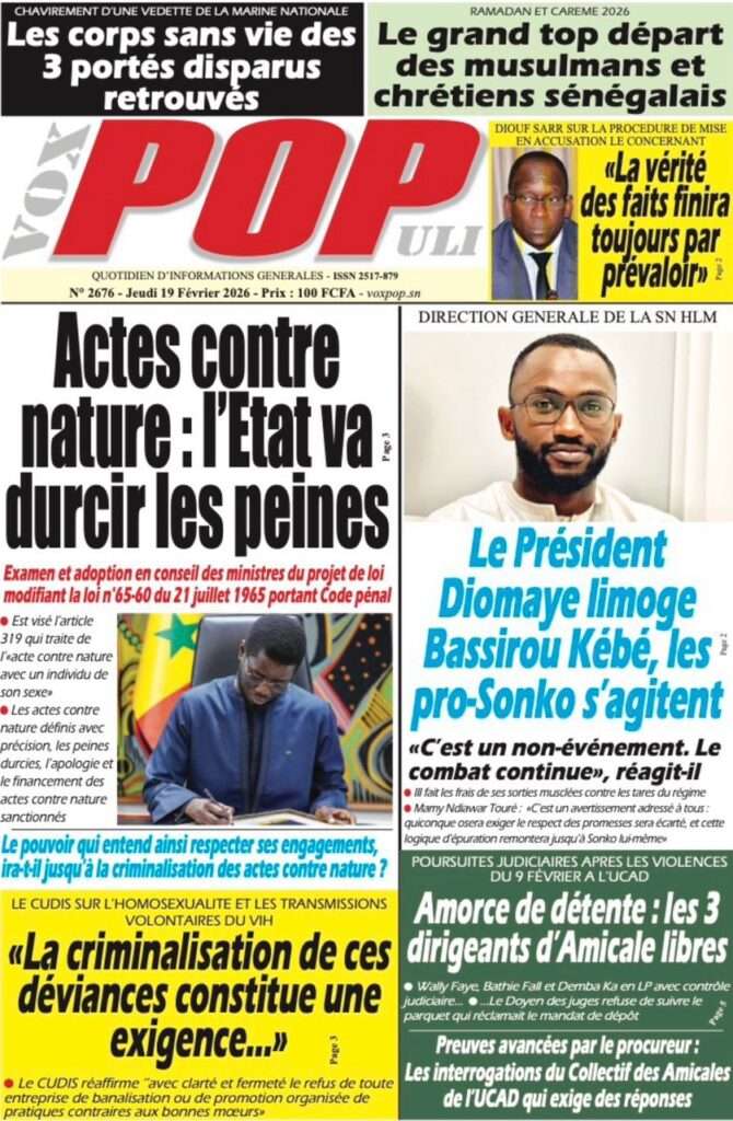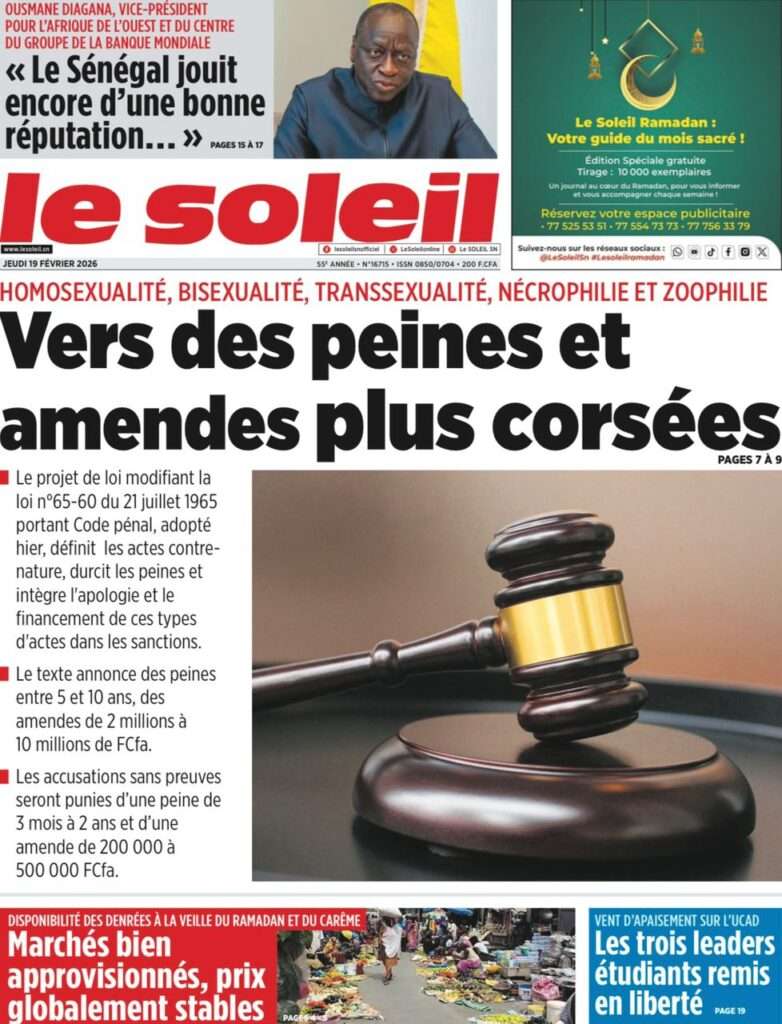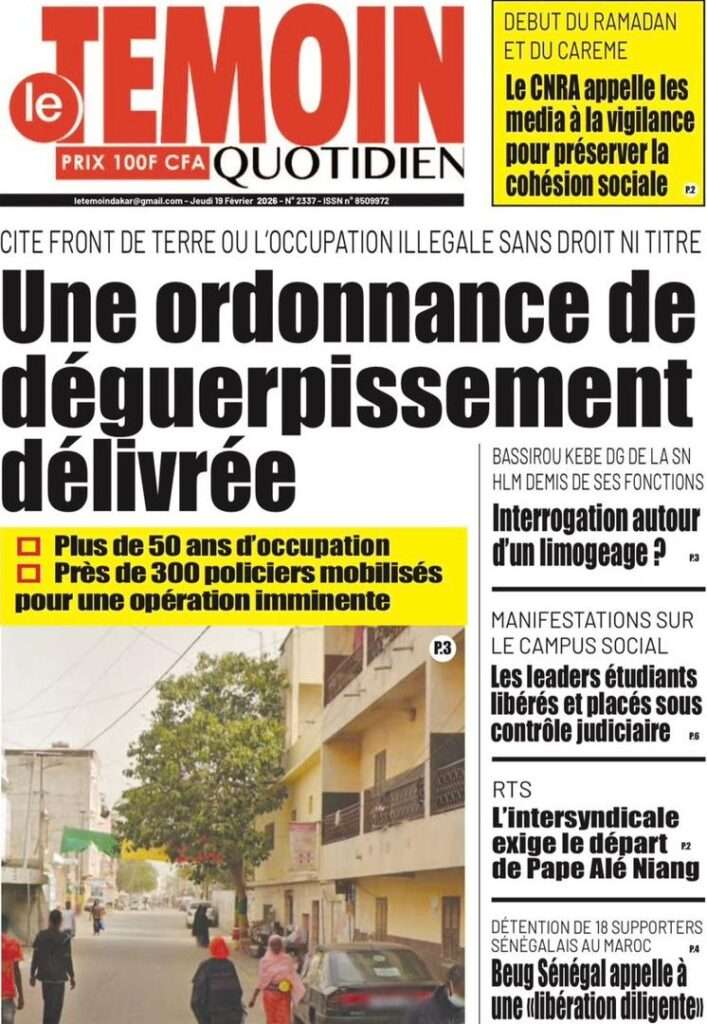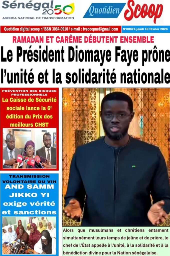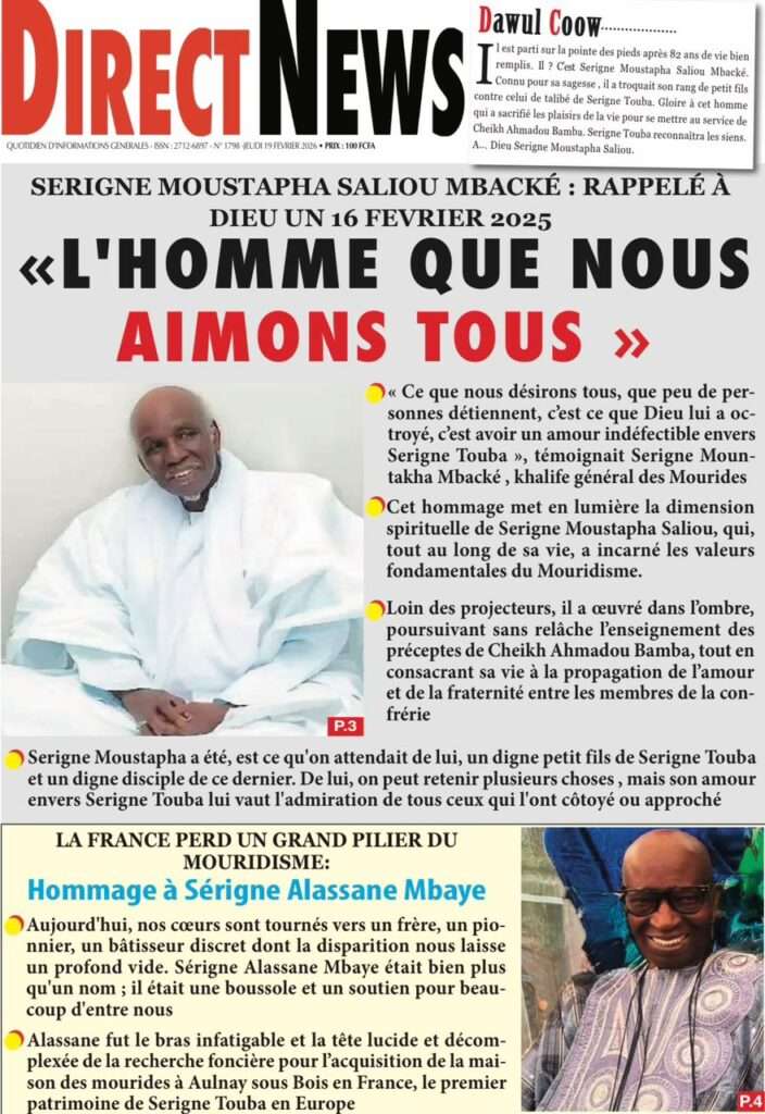 A la Une Actualité La Une Des Quotidiens – Jeudi 19 Février 2026 (Avec Ma Revue De Presse) Bour Sine février 19, 2026 0 Post navigation Previous: Communiqué du Conseil des ministres du mercredi 18 février 2026Next: ÉPHÉMÉRIDES DU 19 FÉVRIER More Stories A la Une Actualité Politique Ce que change la nouvelle loi électorale adoptée par les députés Bour Sine avril 28, 2026 0 A la Une Actualité Politique « Ensemble, nous sommes une force »Par Hamidou Thiaw, Président du MPR Bour Sine avril 28, 2026 0 A la Une Actualité Pape Malick Ndour envoyé en prison Bour Sine avril 28, 2026 0 Laisser un commentaire Annuler la réponseVotre adresse e-mail ne sera pas publiée. Les champs obligatoires sont indiqués avec *Commentaire * Nom * E-mail * Site web Enregistrer mon nom, mon e-mail et mon site dans le navigateur pour mon prochain commentaire.