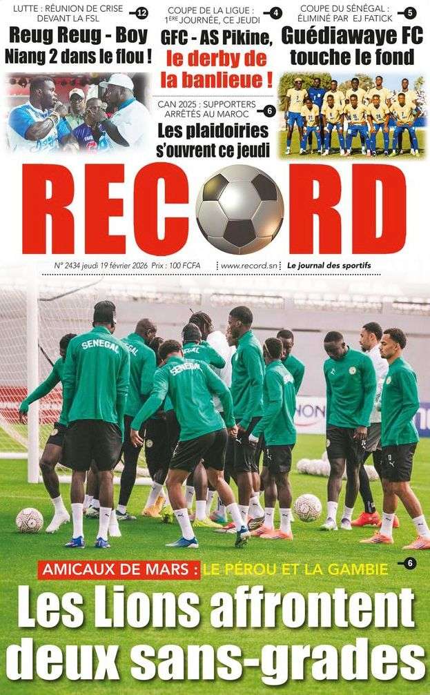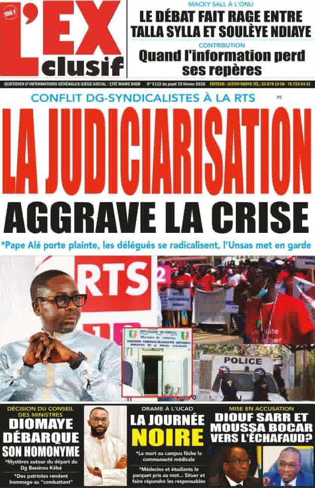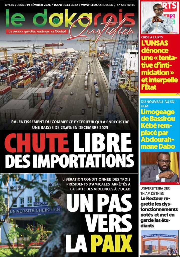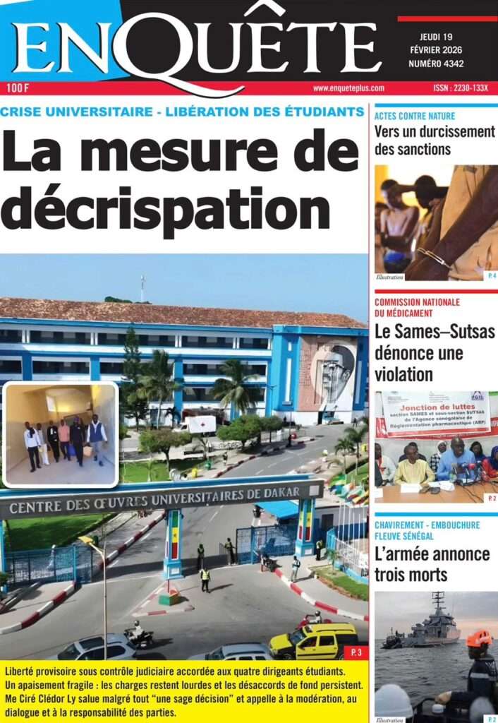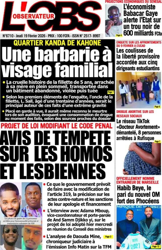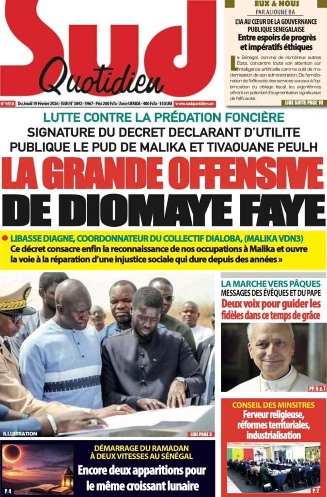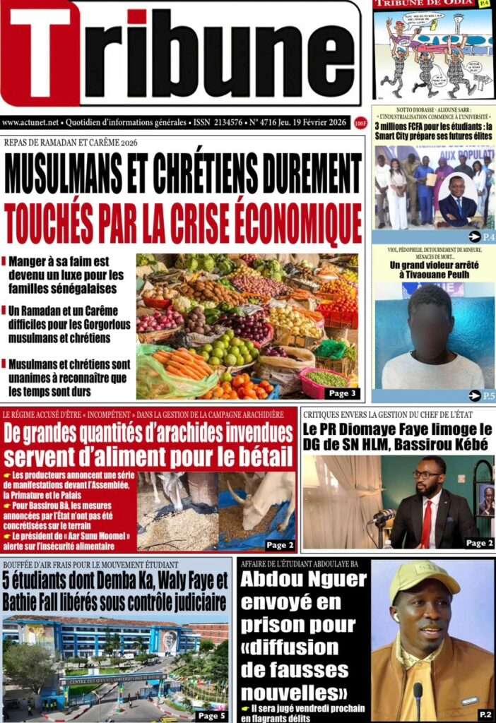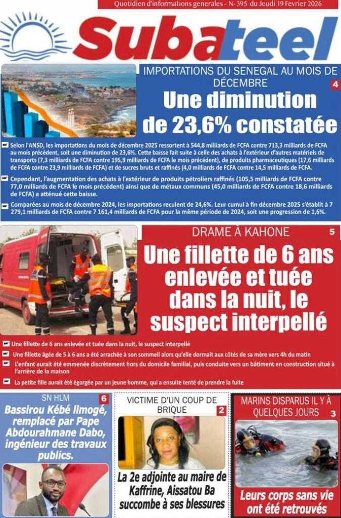 A la Une Actualité La Une Des Quotidiens – Jeudi 19 Février 2026 (Avec Ma Revue De Presse) Bour Sine février 19, 2026 0 Post navigation Previous: Communiqué du Conseil des ministres du mercredi 18 février 2026Next: ÉPHÉMÉRIDES DU 19 FÉVRIER More Stories A la Une Actualité Politique Ce que change la nouvelle loi électorale adoptée par les députés Bour Sine avril 28, 2026 0 A la Une Actualité Politique « Ensemble, nous sommes une force »Par Hamidou Thiaw, Président du MPR Bour Sine avril 28, 2026 0 A la Une Actualité Pape Malick Ndour envoyé en prison Bour Sine avril 28, 2026 0 Laisser un commentaire Annuler la réponseVotre adresse e-mail ne sera pas publiée. Les champs obligatoires sont indiqués avec *Commentaire * Nom * E-mail * Site web Enregistrer mon nom, mon e-mail et mon site dans le navigateur pour mon prochain commentaire.