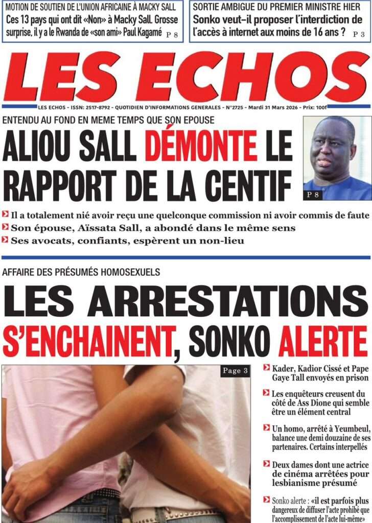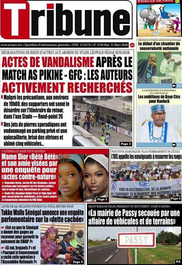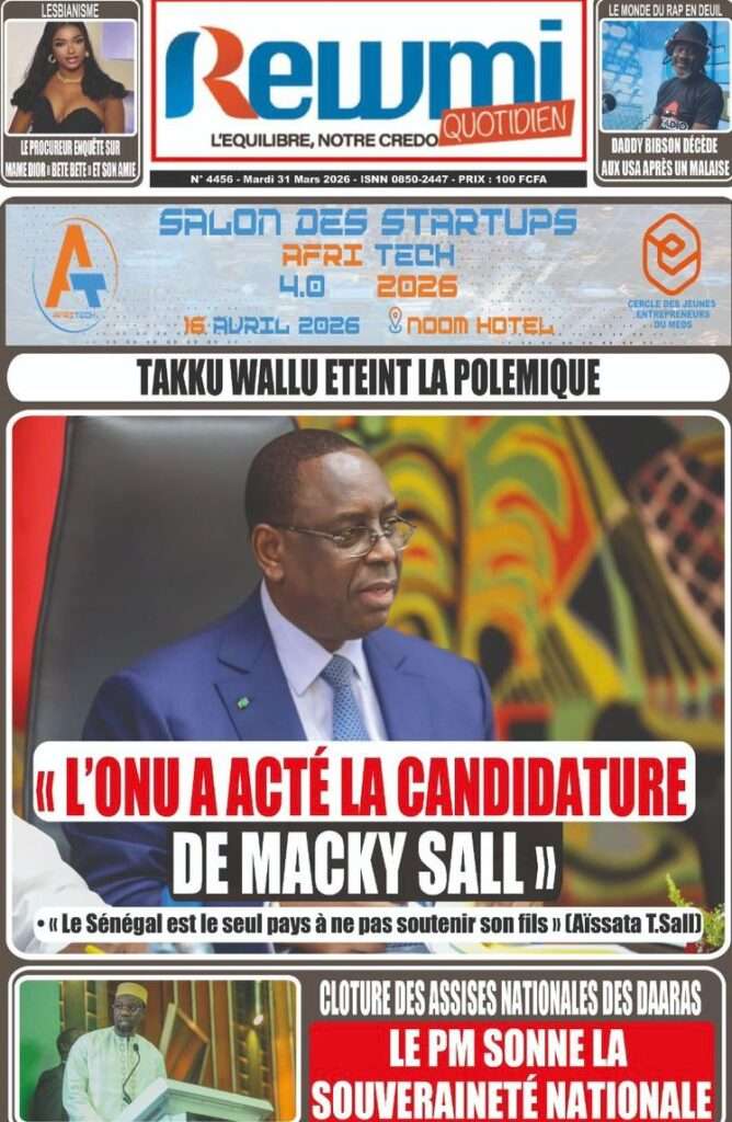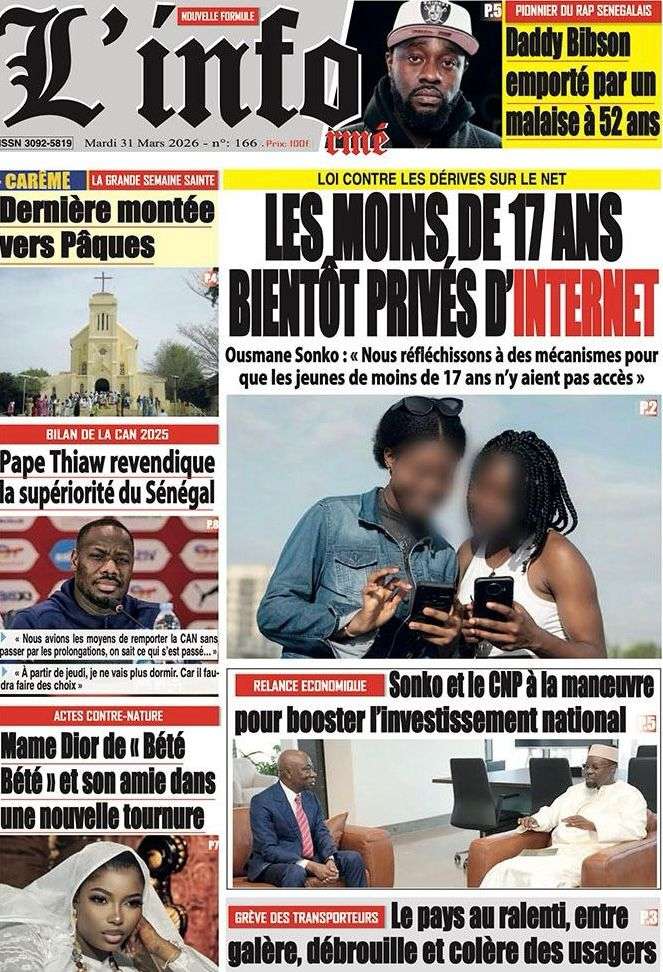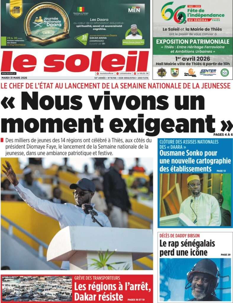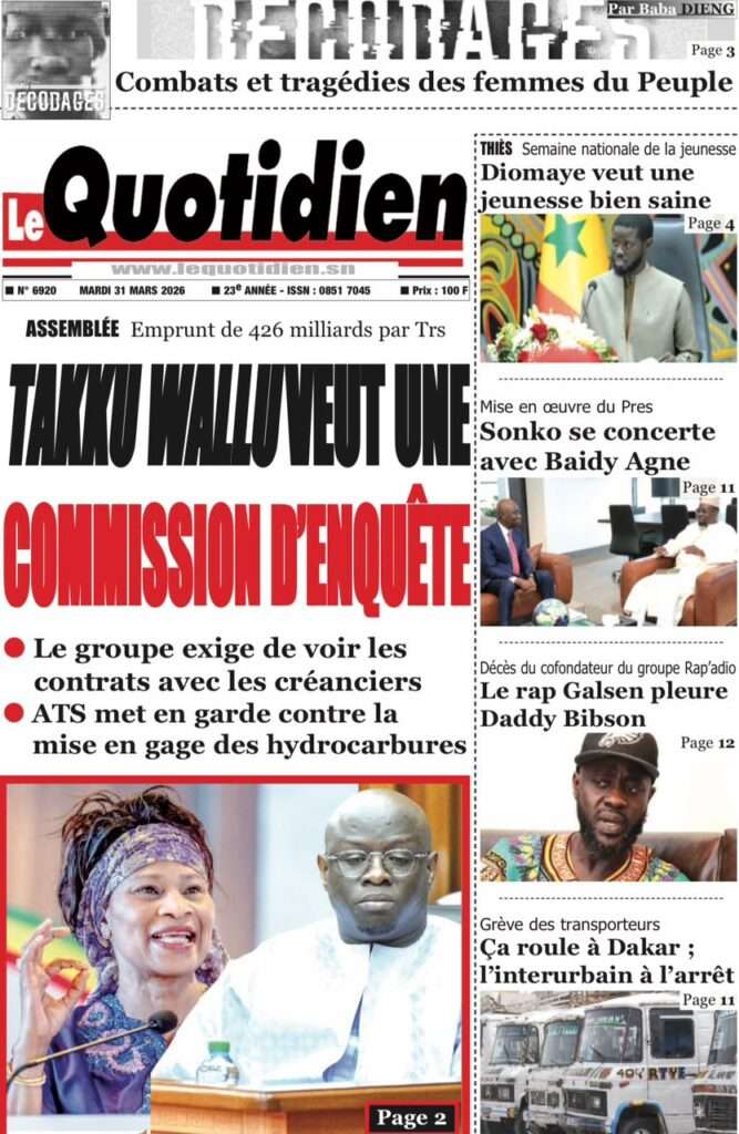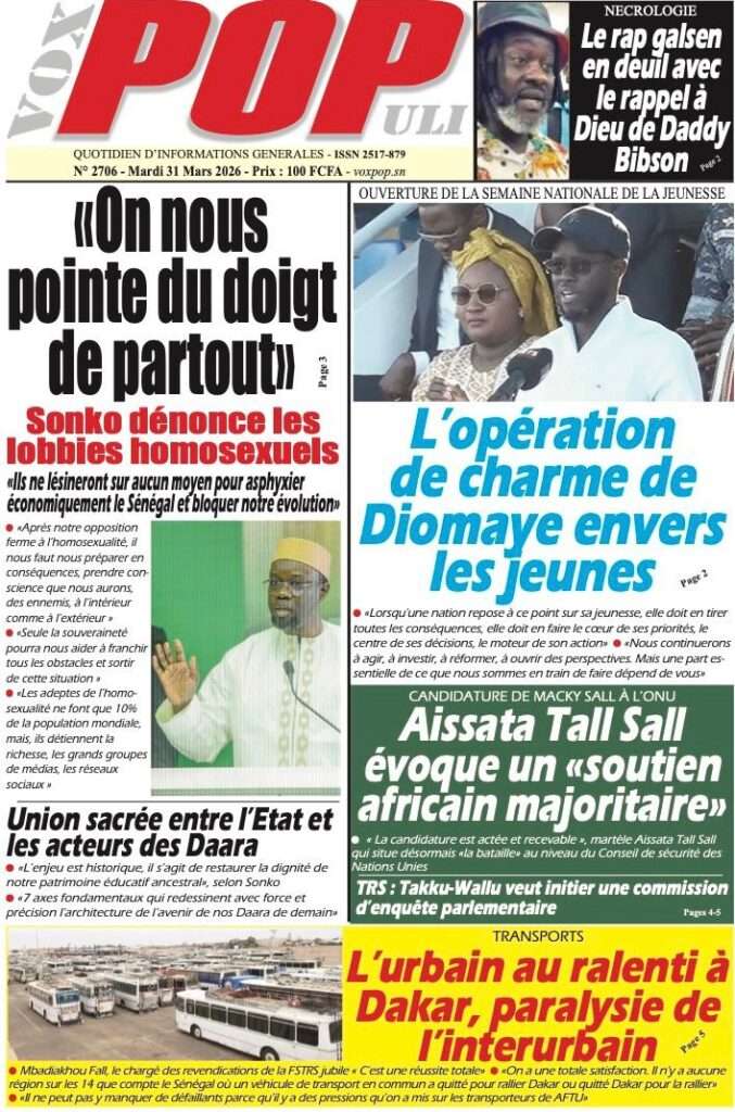 A la Une Actualité Une Des Quotidiens – Mardi 31 Mars 2026 (Avec Ma Revue De Presse) Bour Sine mars 31, 2026 0 Post navigation Previous: Nécrologie : Décès du rappeur Daddy Bibson, pionnier du rap wolofNext: Durcissement des sanctions contre l’homosexualité : la loi promulguée par le président Diomaye More Stories A la Une Actualité Politique Ce que change la nouvelle loi électorale adoptée par les députés Bour Sine avril 28, 2026 0 A la Une Actualité Politique « Ensemble, nous sommes une force »Par Hamidou Thiaw, Président du MPR Bour Sine avril 28, 2026 0 A la Une Actualité Pape Malick Ndour envoyé en prison Bour Sine avril 28, 2026 0 Laisser un commentaire Annuler la réponseVotre adresse e-mail ne sera pas publiée. Les champs obligatoires sont indiqués avec *Commentaire * Nom * E-mail * Site web Enregistrer mon nom, mon e-mail et mon site dans le navigateur pour mon prochain commentaire.