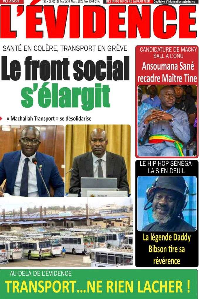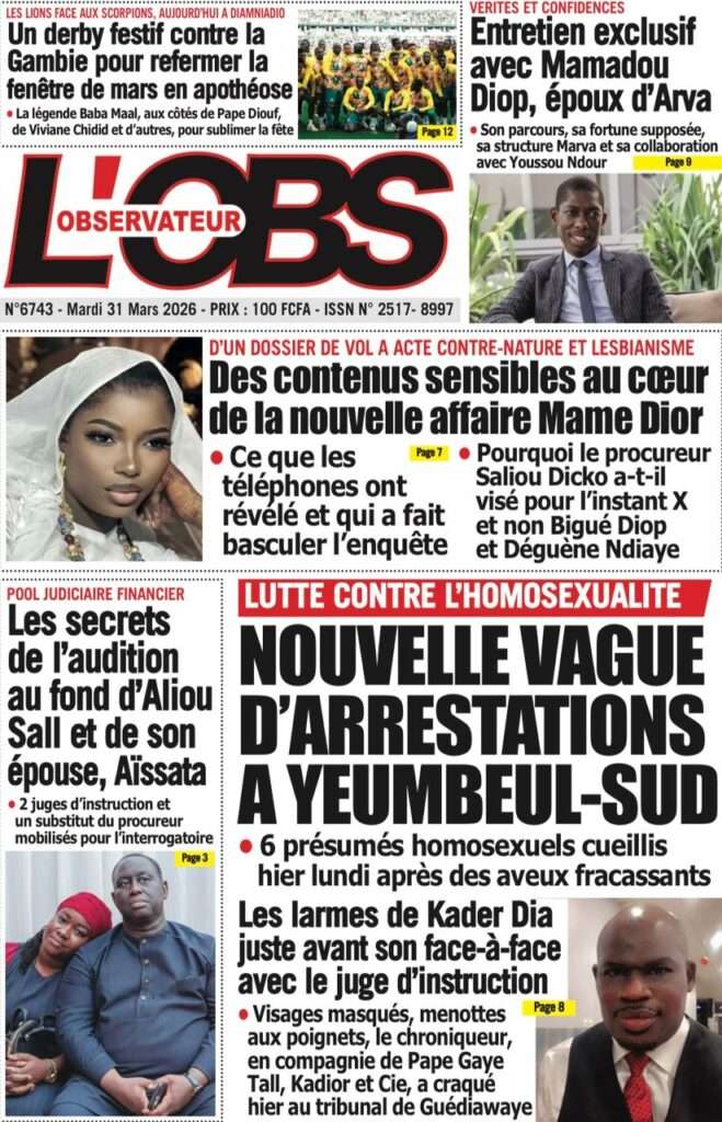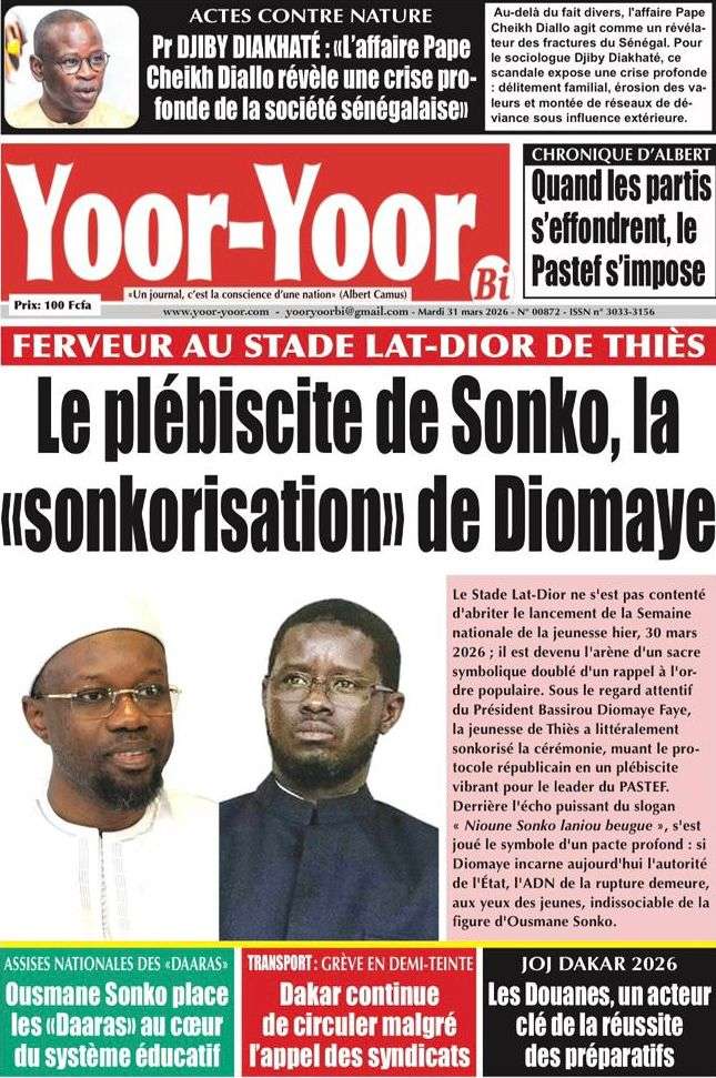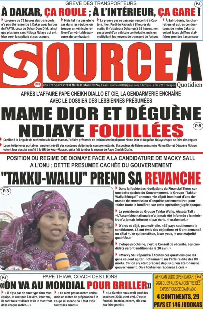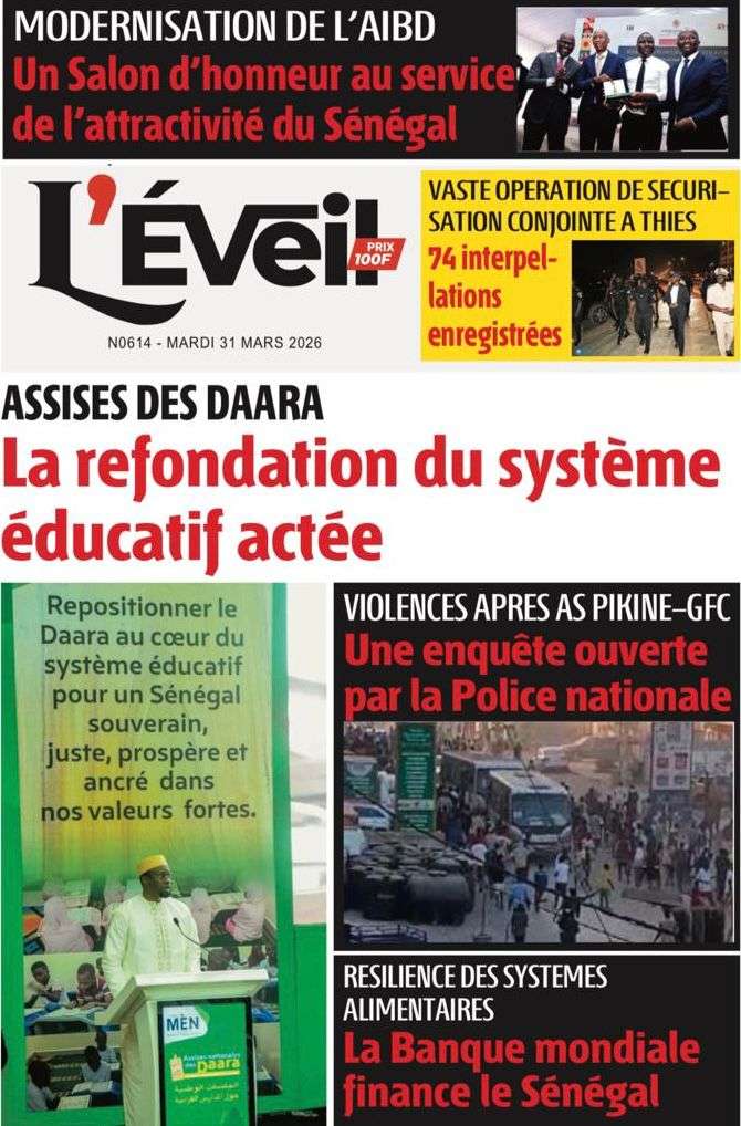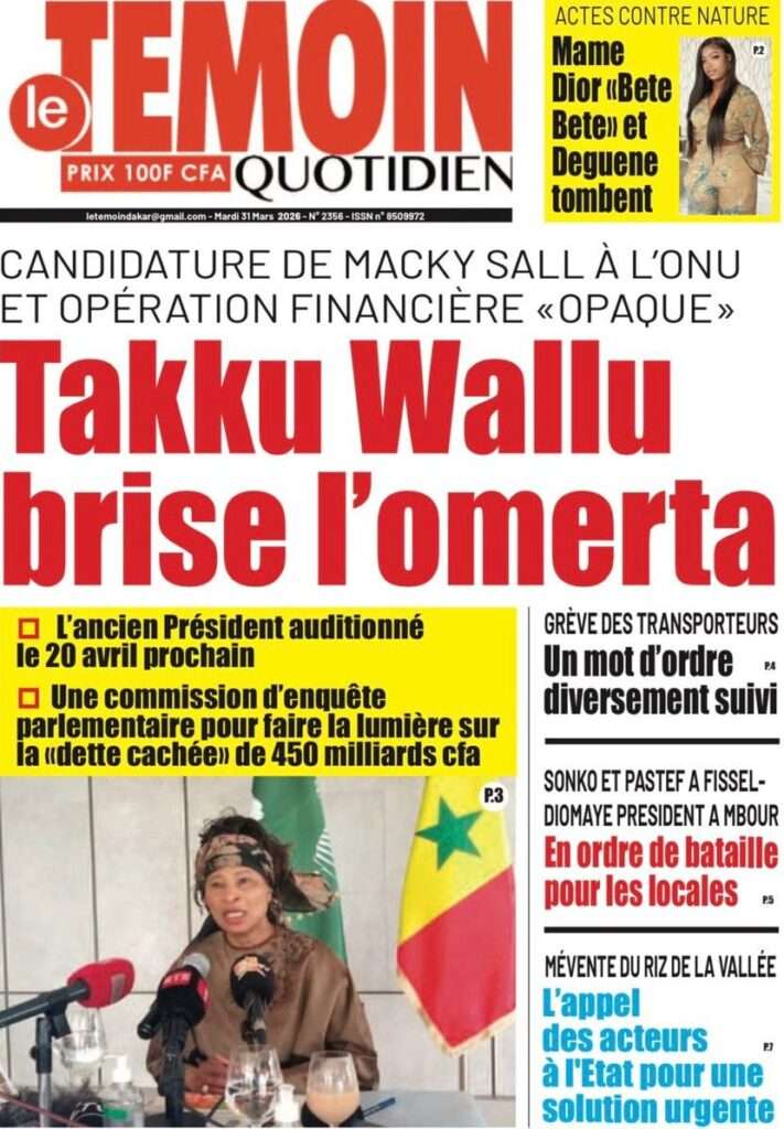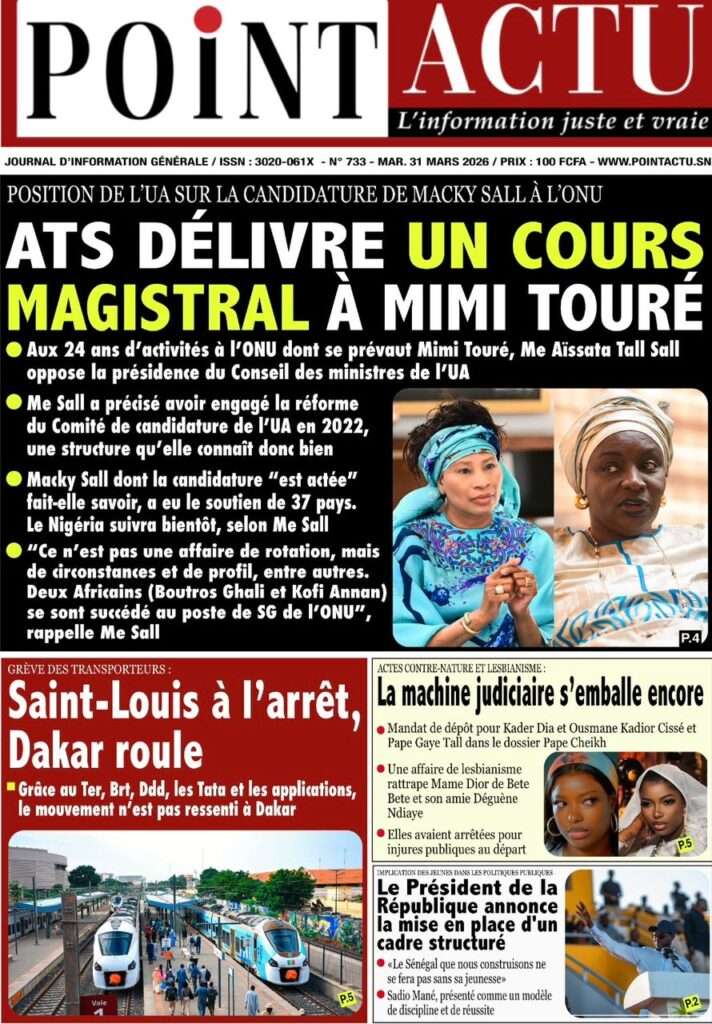 A la Une Actualité Une Des Quotidiens – Mardi 31 Mars 2026 (Avec Ma Revue De Presse) Bour Sine mars 31, 2026 0 Post navigation Previous: Nécrologie : Décès du rappeur Daddy Bibson, pionnier du rap wolofNext: Durcissement des sanctions contre l’homosexualité : la loi promulguée par le président Diomaye More Stories A la Une Actualité Politique Ce que change la nouvelle loi électorale adoptée par les députés Bour Sine avril 28, 2026 0 A la Une Actualité Politique « Ensemble, nous sommes une force »Par Hamidou Thiaw, Président du MPR Bour Sine avril 28, 2026 0 A la Une Actualité Pape Malick Ndour envoyé en prison Bour Sine avril 28, 2026 0 Laisser un commentaire Annuler la réponseVotre adresse e-mail ne sera pas publiée. Les champs obligatoires sont indiqués avec *Commentaire * Nom * E-mail * Site web Enregistrer mon nom, mon e-mail et mon site dans le navigateur pour mon prochain commentaire.