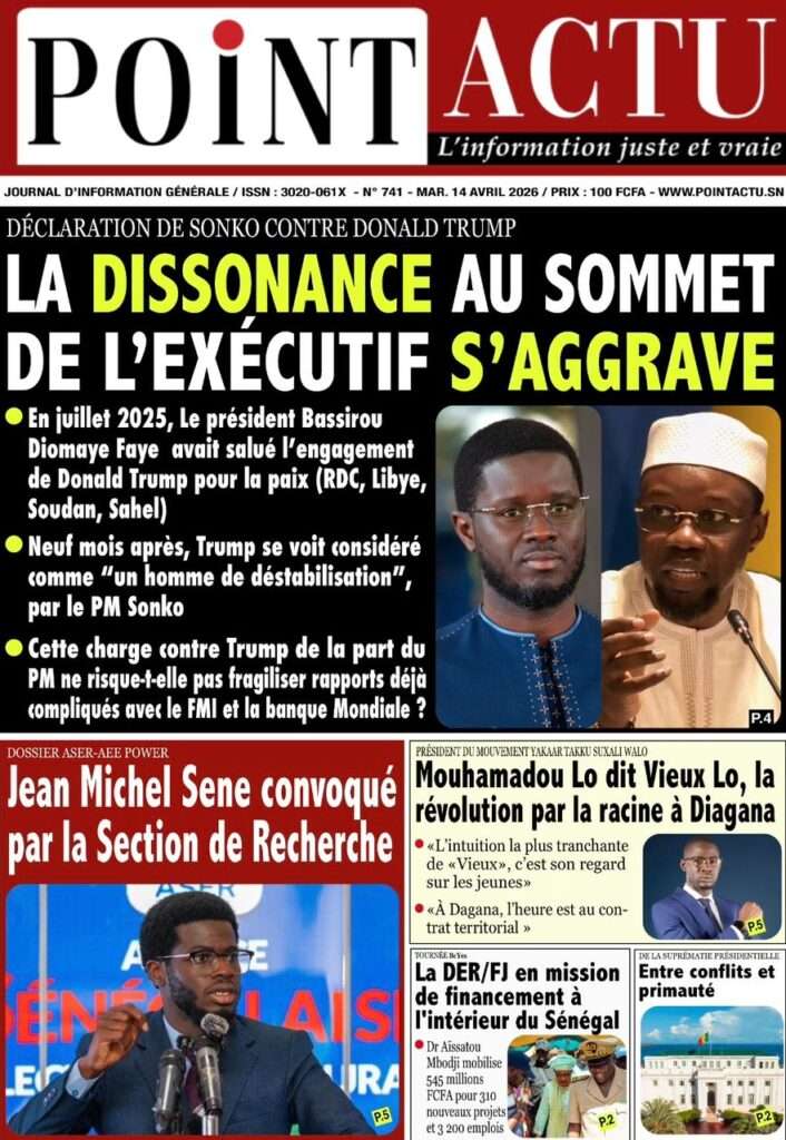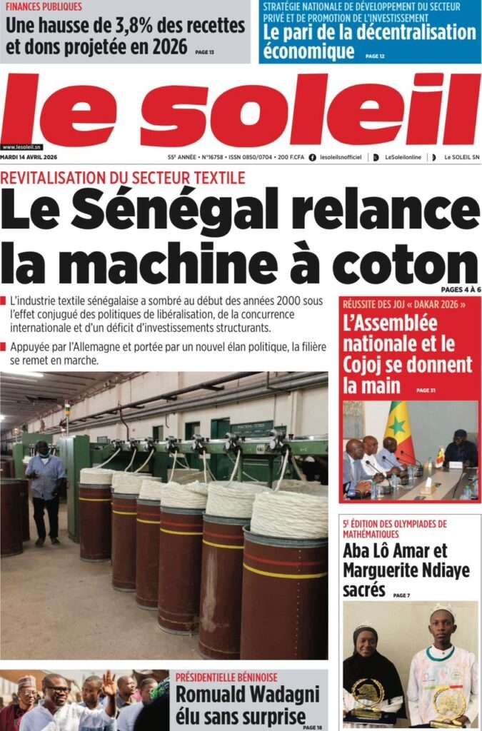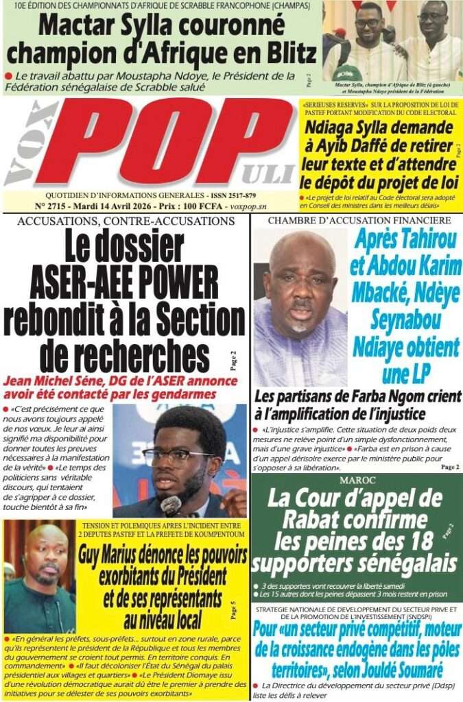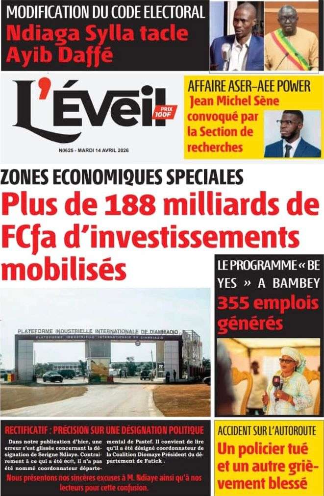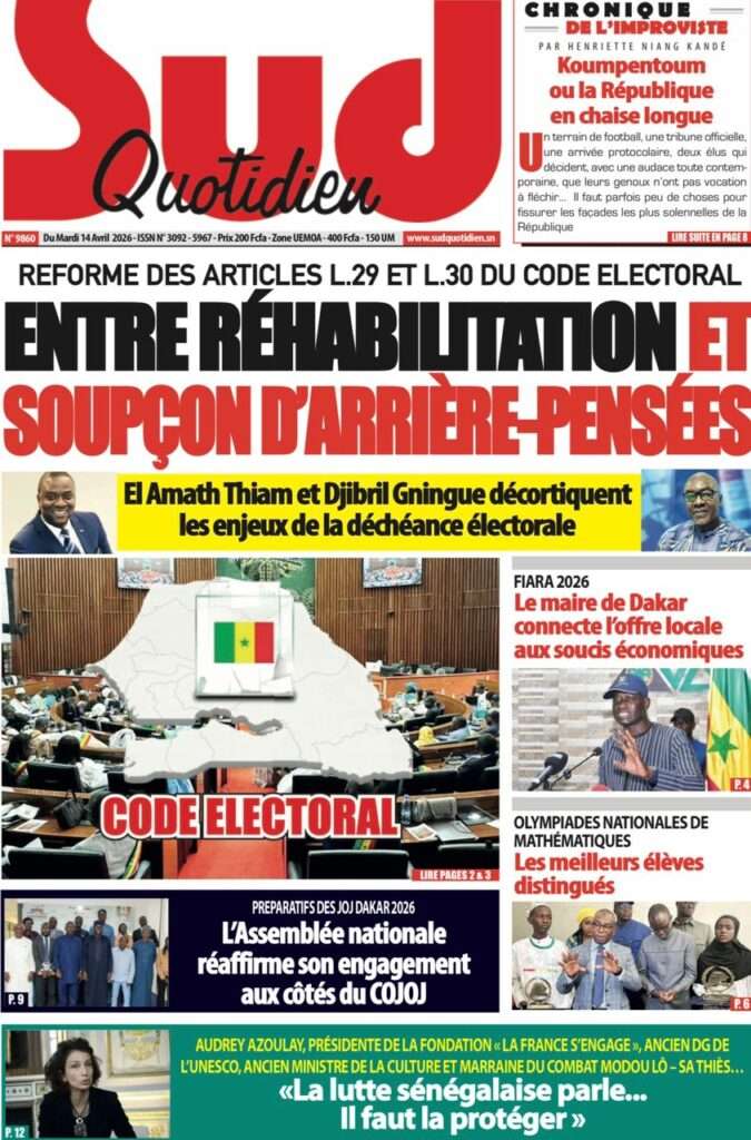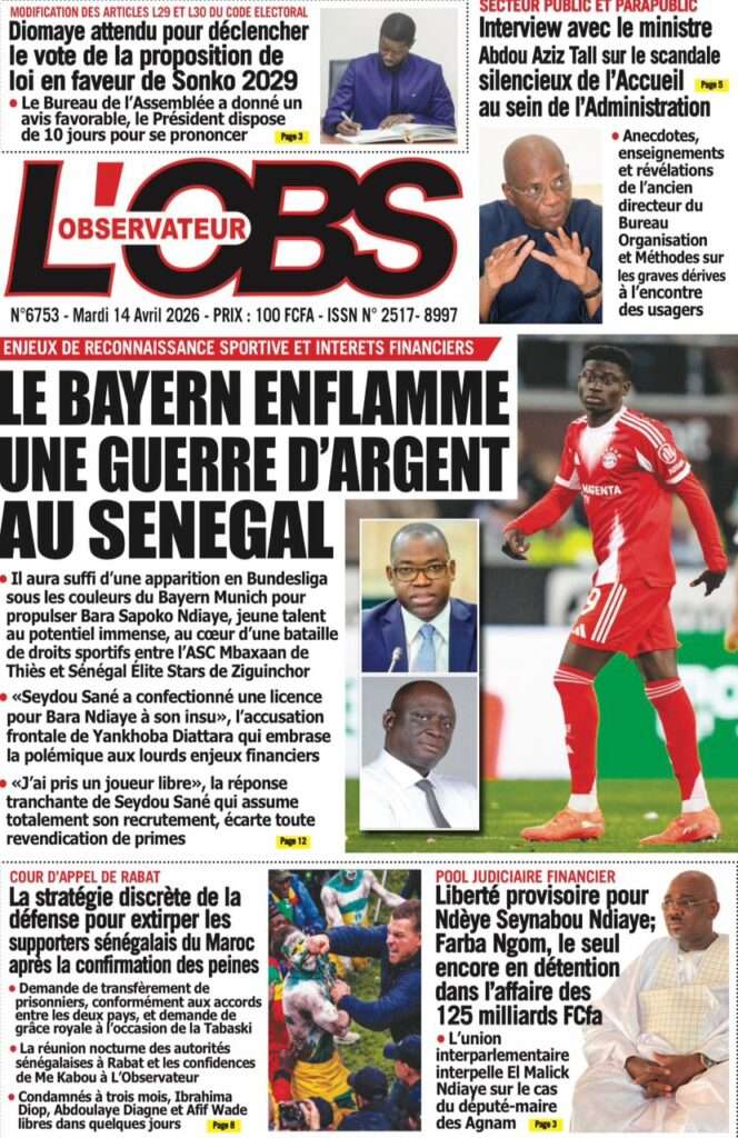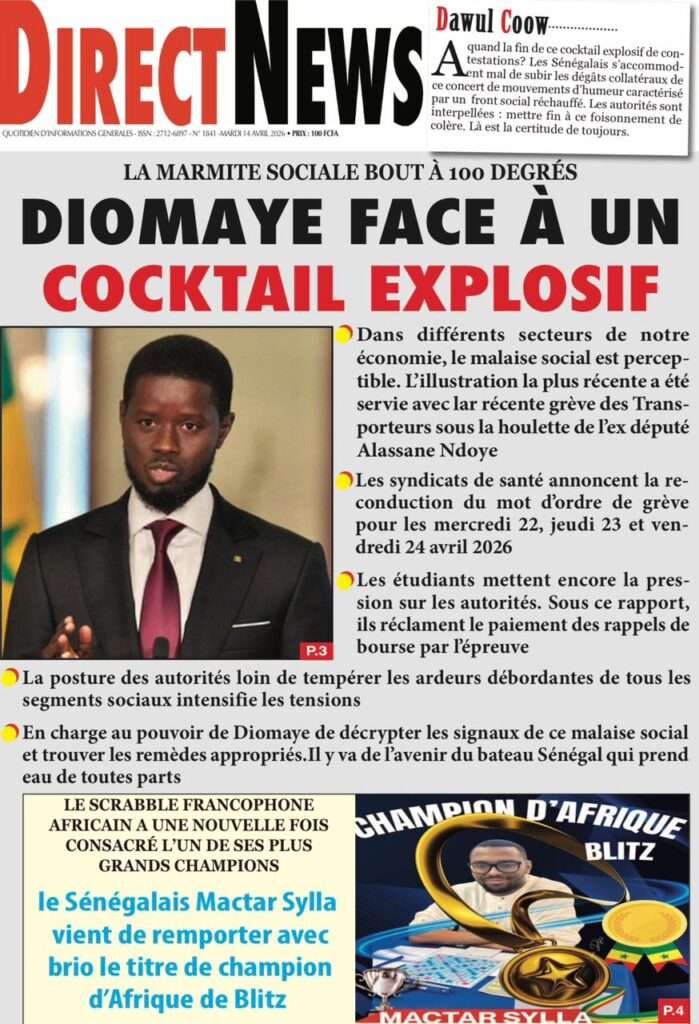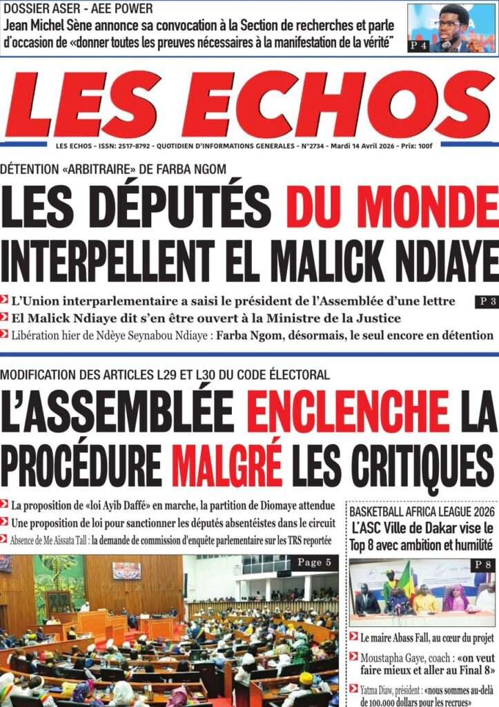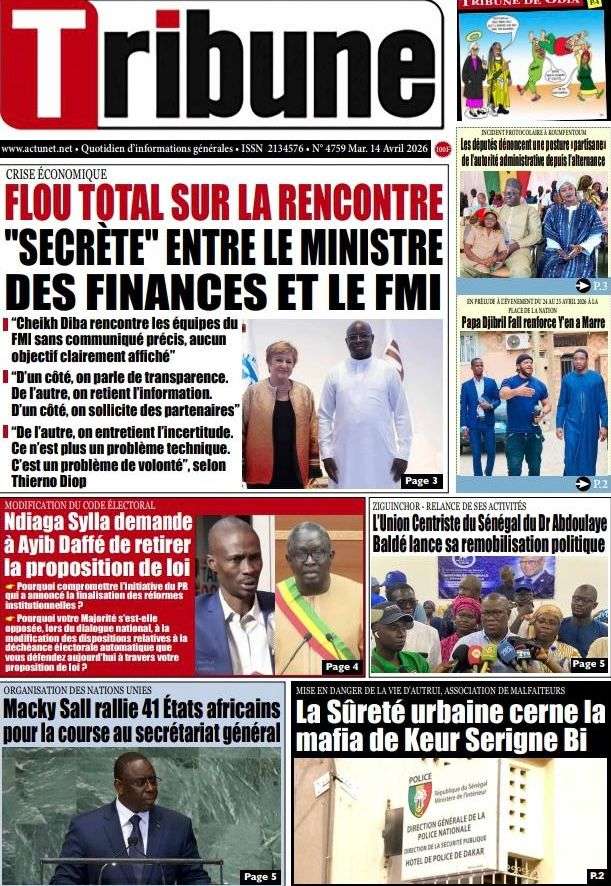 A la Une Actualité La Une Des Quotidiens – Mardi 14 Avril 2026 (Avec Ma Revue De Presse) Bour Sine avril 14, 2026 0 Post navigation Previous: Première condamnation actée : la nouvelle loi contre l’homosexualité en marcheNext: Jugés en appel sans preuves, les 18 supporters sénégalais restent condamnés More Stories A la Une Actualité Politique Ce que change la nouvelle loi électorale adoptée par les députés Bour Sine avril 28, 2026 0 A la Une Actualité Politique « Ensemble, nous sommes une force »Par Hamidou Thiaw, Président du MPR Bour Sine avril 28, 2026 0 A la Une Actualité Pape Malick Ndour envoyé en prison Bour Sine avril 28, 2026 0 Laisser un commentaire Annuler la réponseVotre adresse e-mail ne sera pas publiée. Les champs obligatoires sont indiqués avec *Commentaire * Nom * E-mail * Site web Enregistrer mon nom, mon e-mail et mon site dans le navigateur pour mon prochain commentaire.