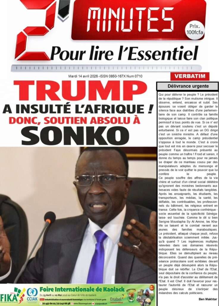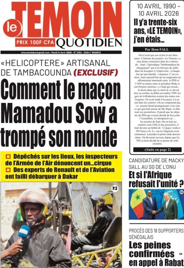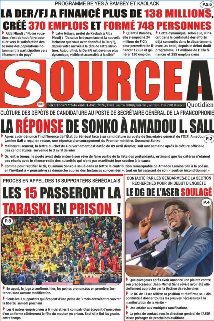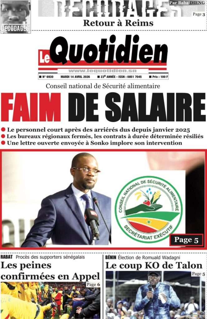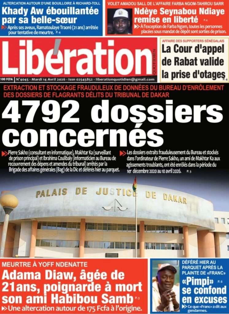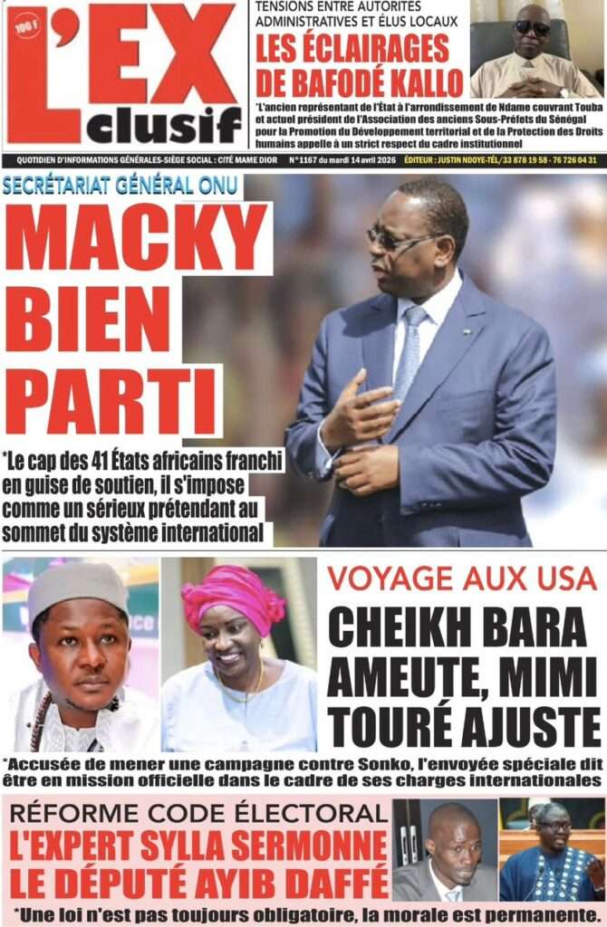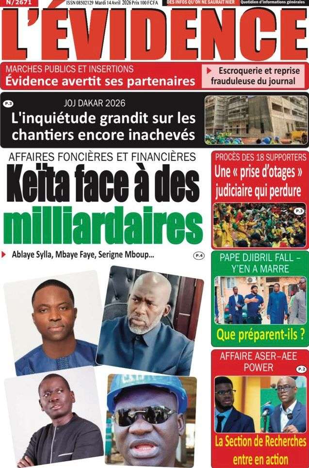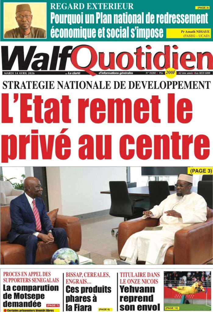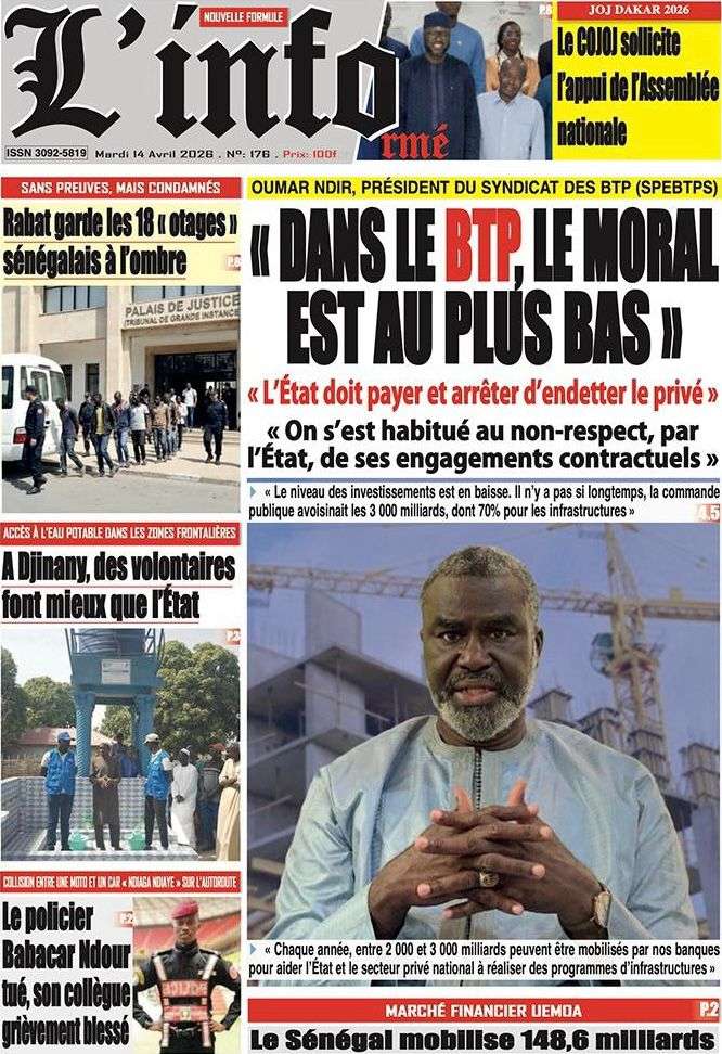 A la Une Actualité La Une Des Quotidiens – Mardi 14 Avril 2026 (Avec Ma Revue De Presse) Bour Sine avril 14, 2026 0 Post navigation Previous: Première condamnation actée : la nouvelle loi contre l’homosexualité en marcheNext: Jugés en appel sans preuves, les 18 supporters sénégalais restent condamnés More Stories A la Une Actualité Politique Ce que change la nouvelle loi électorale adoptée par les députés Bour Sine avril 28, 2026 0 A la Une Actualité Politique « Ensemble, nous sommes une force »Par Hamidou Thiaw, Président du MPR Bour Sine avril 28, 2026 0 A la Une Actualité Pape Malick Ndour envoyé en prison Bour Sine avril 28, 2026 0 Laisser un commentaire Annuler la réponseVotre adresse e-mail ne sera pas publiée. Les champs obligatoires sont indiqués avec *Commentaire * Nom * E-mail * Site web Enregistrer mon nom, mon e-mail et mon site dans le navigateur pour mon prochain commentaire.