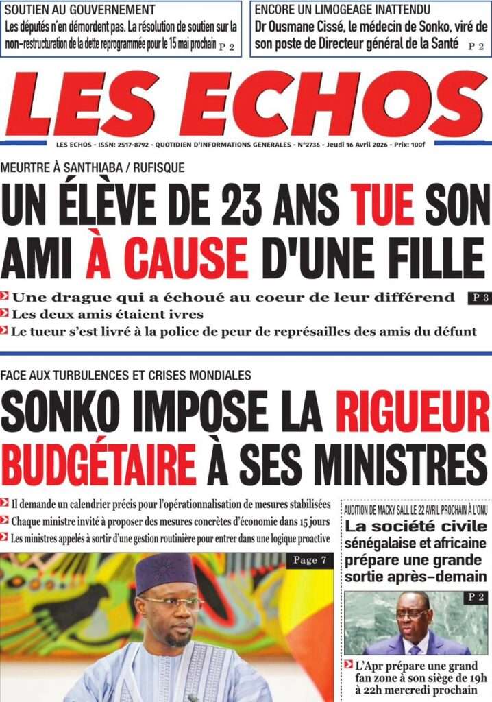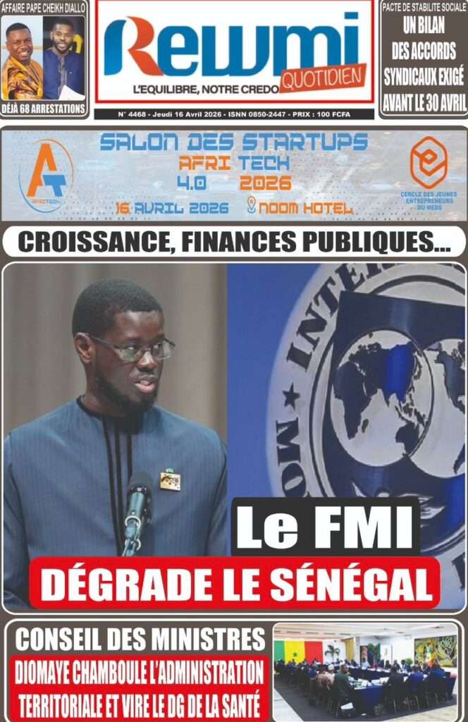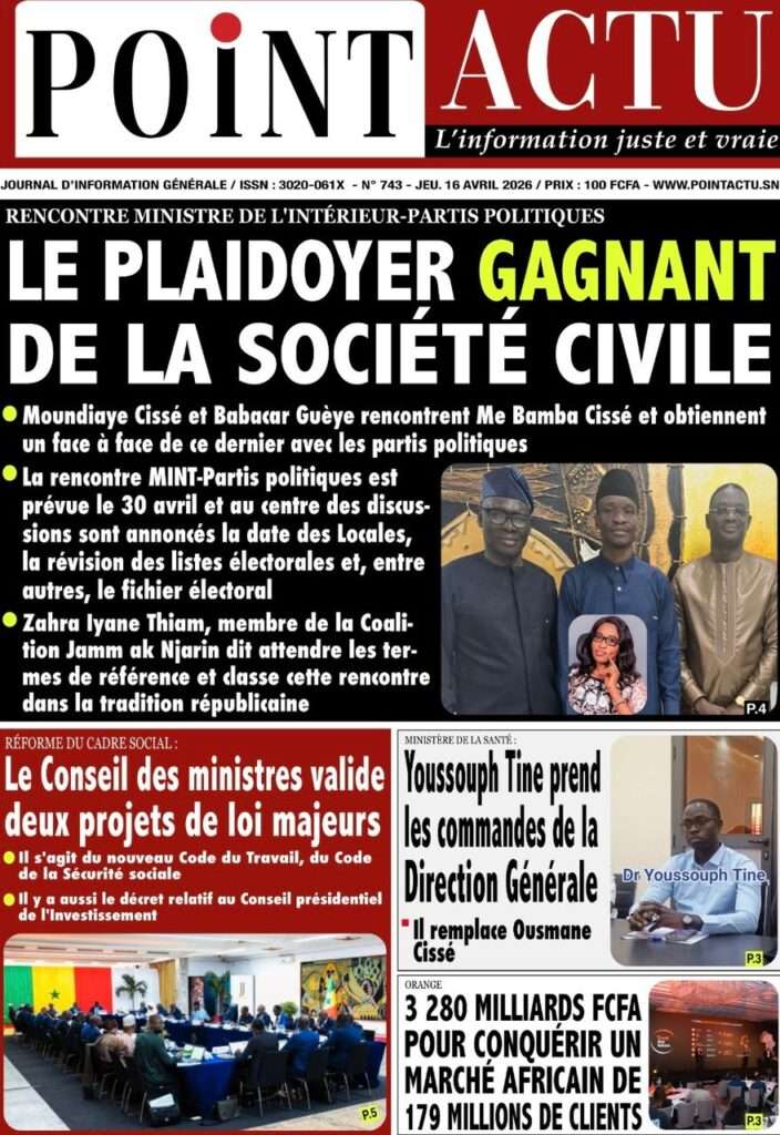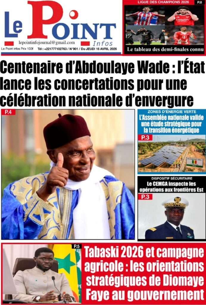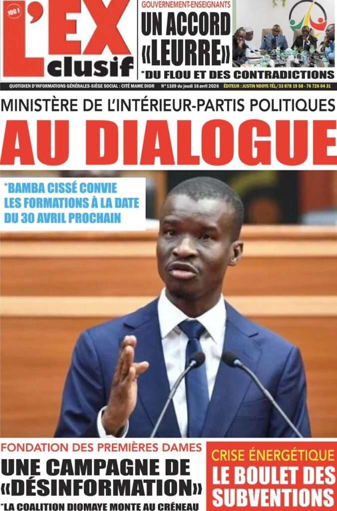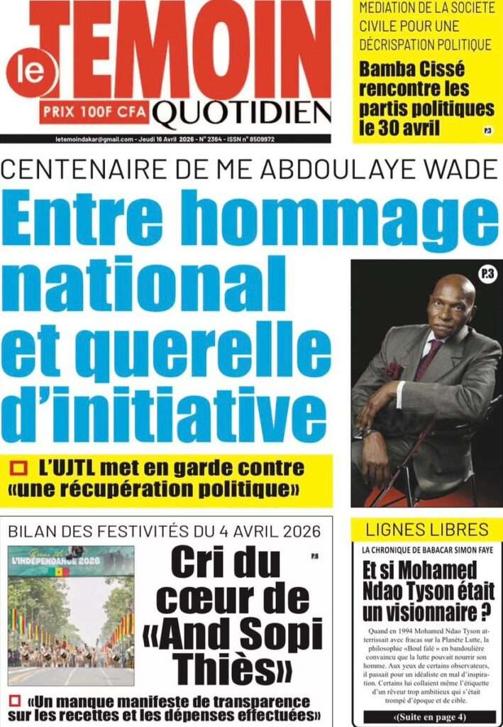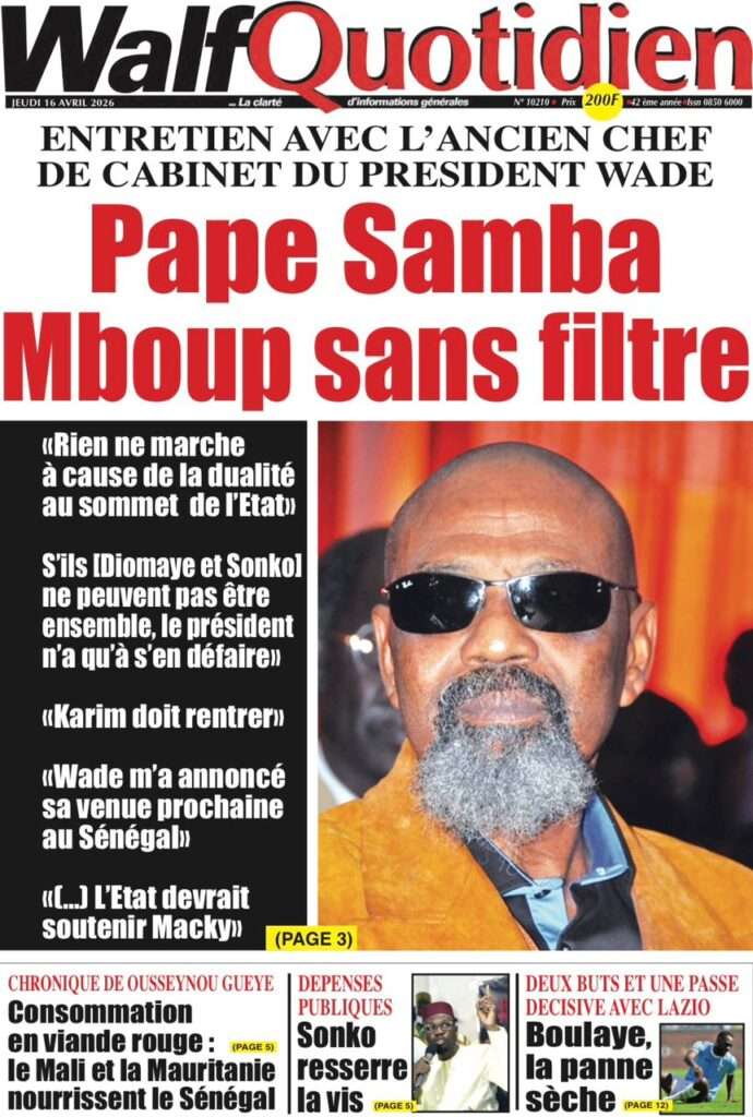 A la Une Actualité La Une Des Quotidiens – Jeudi 16 Avril 2026 (Avec Ma Revue De Presse) Bour Sine avril 16, 2026 0 Post navigation Previous: Candidature de Macky Sall : ce qui se passe sous nos yeux est révélateur, dixit Thierno LONext: ÉPHÉMÉRIDES DU 16 AVRIL (Par Atoumane Mbaye) More Stories A la Une Actualité Politique Ce que change la nouvelle loi électorale adoptée par les députés Bour Sine avril 28, 2026 0 A la Une Actualité Politique « Ensemble, nous sommes une force »Par Hamidou Thiaw, Président du MPR Bour Sine avril 28, 2026 0 A la Une Actualité Pape Malick Ndour envoyé en prison Bour Sine avril 28, 2026 0 Laisser un commentaire Annuler la réponseVotre adresse e-mail ne sera pas publiée. Les champs obligatoires sont indiqués avec *Commentaire * Nom * E-mail * Site web Enregistrer mon nom, mon e-mail et mon site dans le navigateur pour mon prochain commentaire.