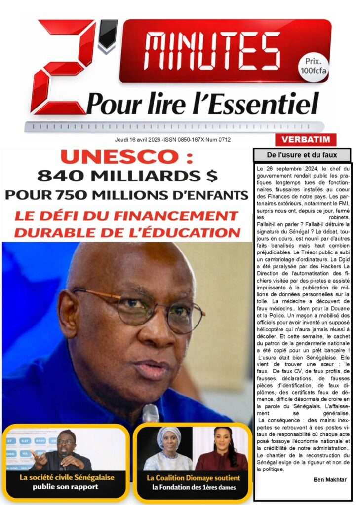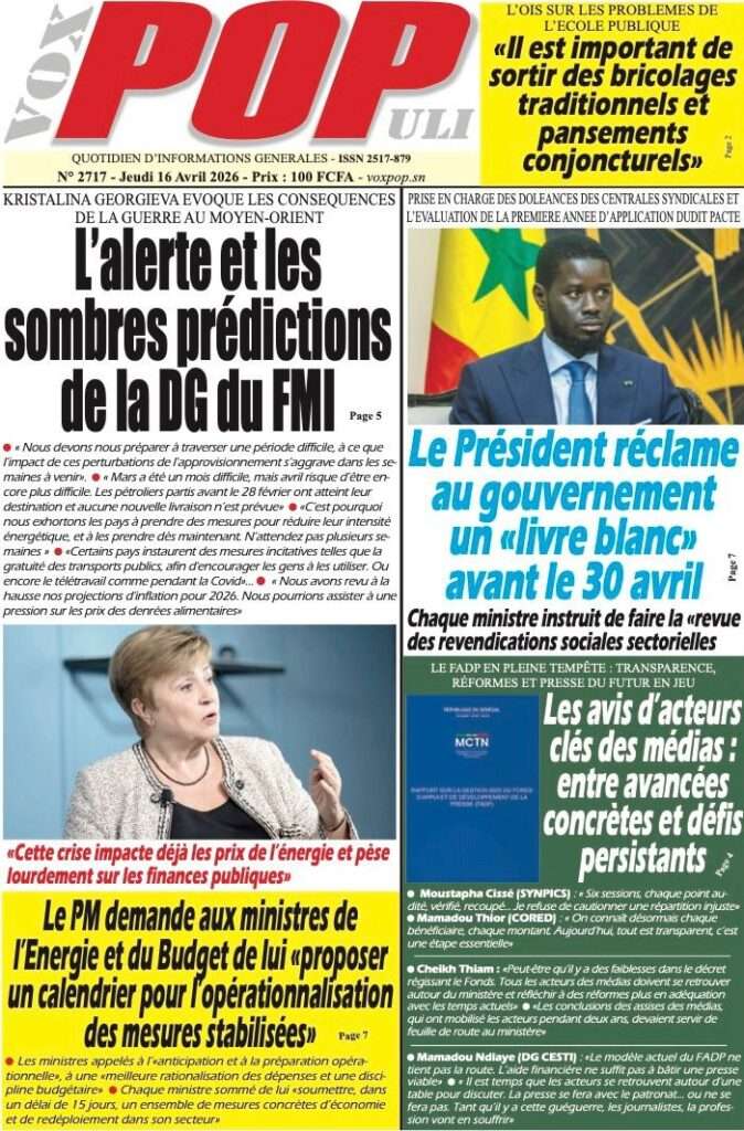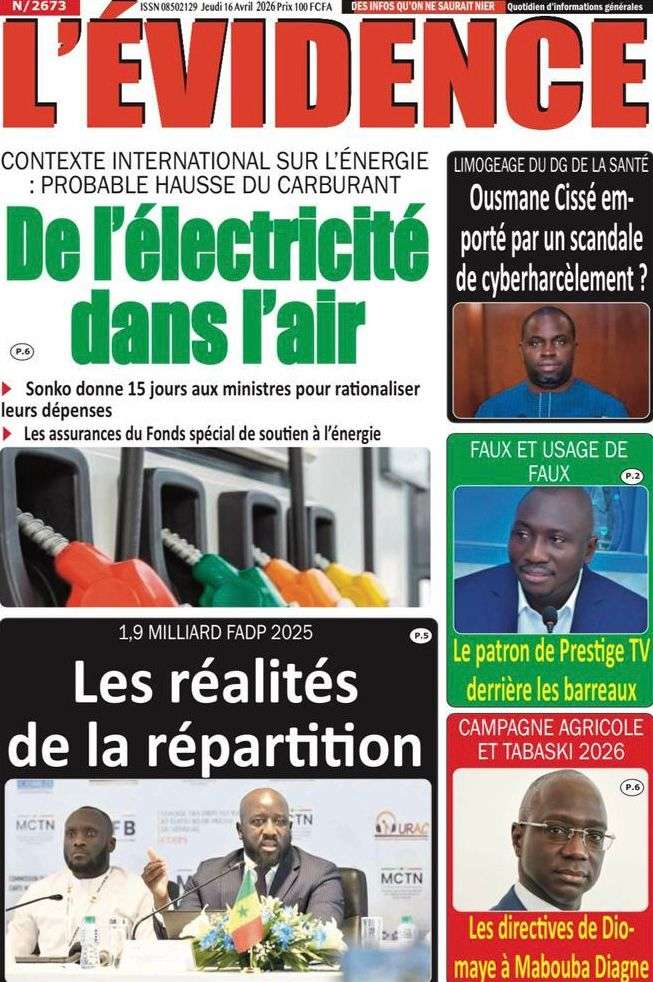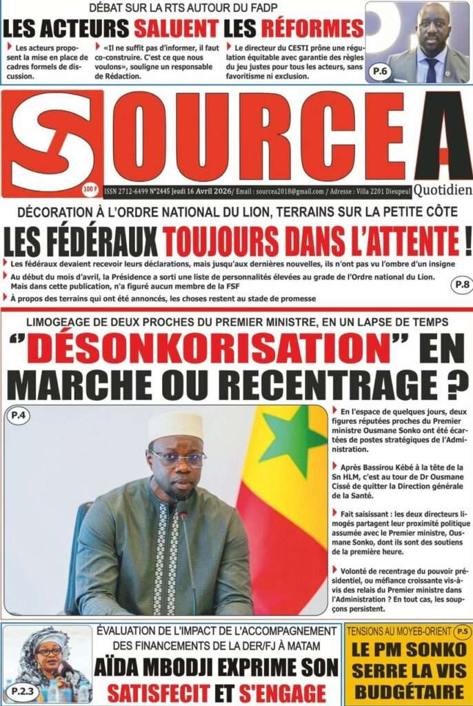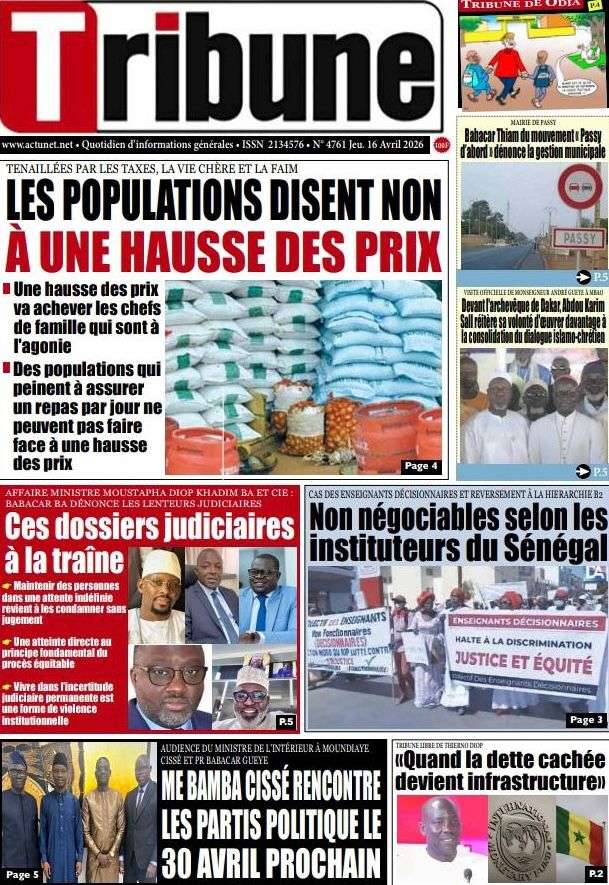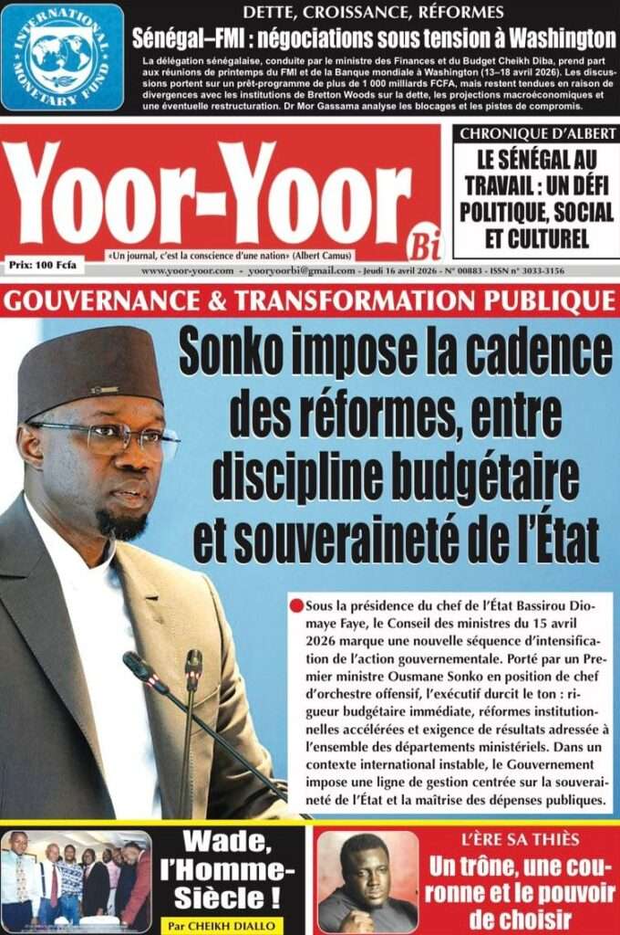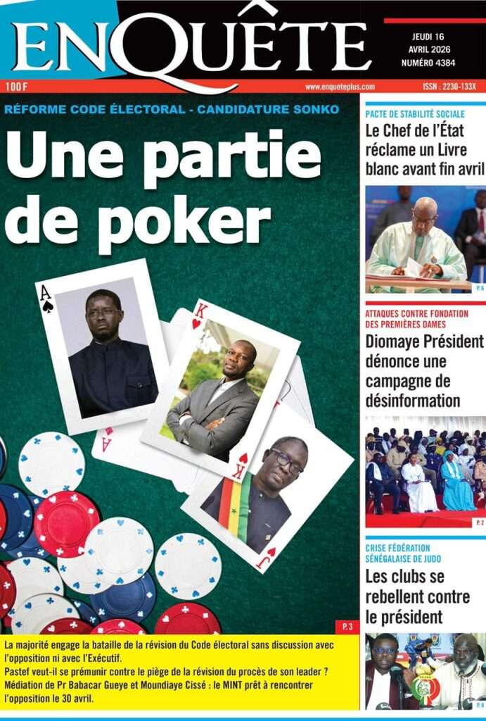 A la Une Actualité La Une Des Quotidiens – Jeudi 16 Avril 2026 (Avec Ma Revue De Presse) Bour Sine avril 16, 2026 0 Post navigation Previous: Candidature de Macky Sall : ce qui se passe sous nos yeux est révélateur, dixit Thierno LONext: ÉPHÉMÉRIDES DU 16 AVRIL (Par Atoumane Mbaye) More Stories A la Une Actualité Politique Ce que change la nouvelle loi électorale adoptée par les députés Bour Sine avril 28, 2026 0 A la Une Actualité Politique « Ensemble, nous sommes une force »Par Hamidou Thiaw, Président du MPR Bour Sine avril 28, 2026 0 A la Une Actualité Pape Malick Ndour envoyé en prison Bour Sine avril 28, 2026 0 Laisser un commentaire Annuler la réponseVotre adresse e-mail ne sera pas publiée. Les champs obligatoires sont indiqués avec *Commentaire * Nom * E-mail * Site web Enregistrer mon nom, mon e-mail et mon site dans le navigateur pour mon prochain commentaire.