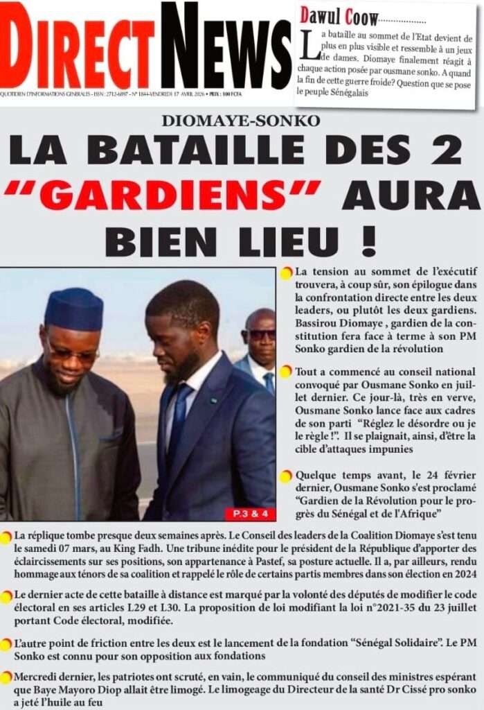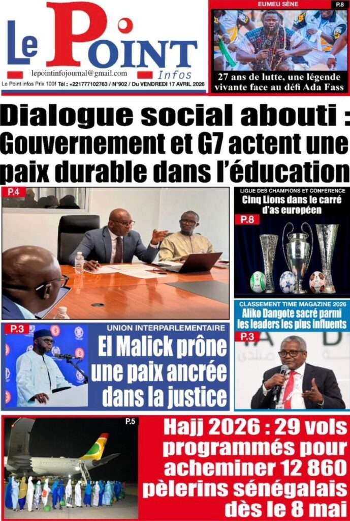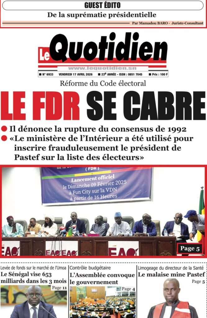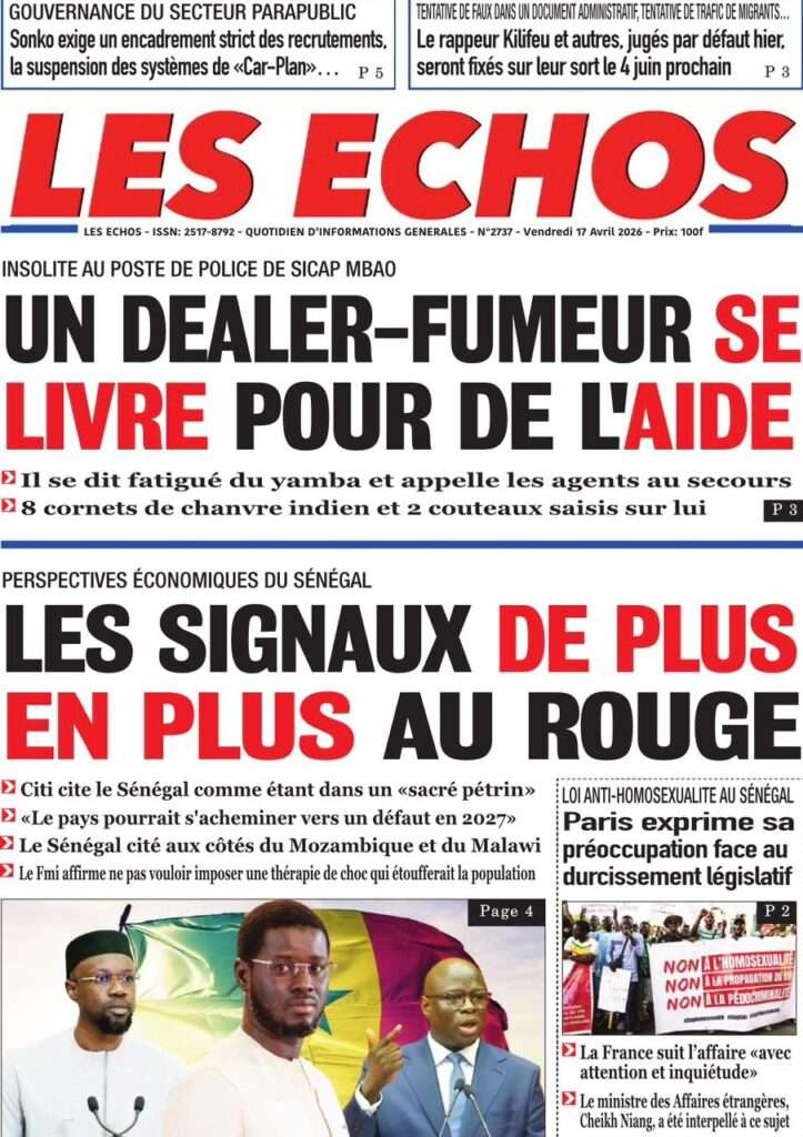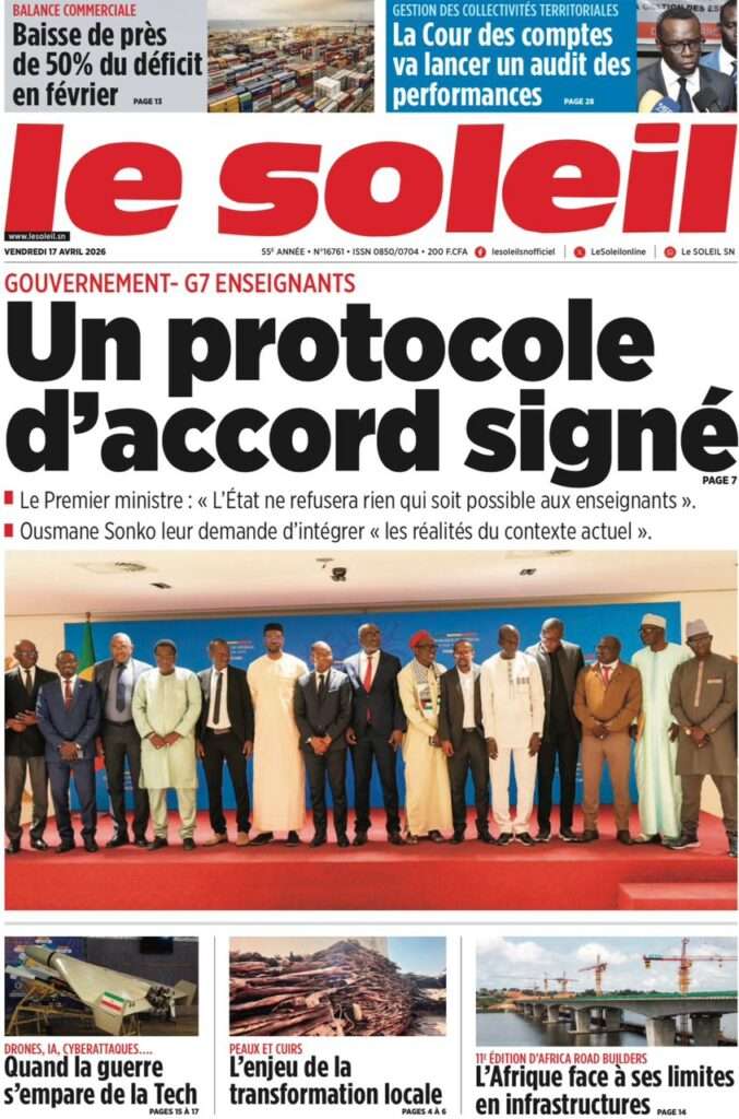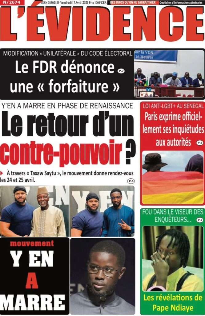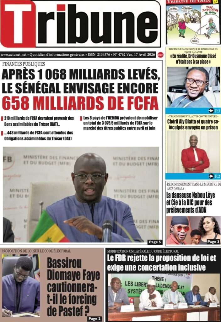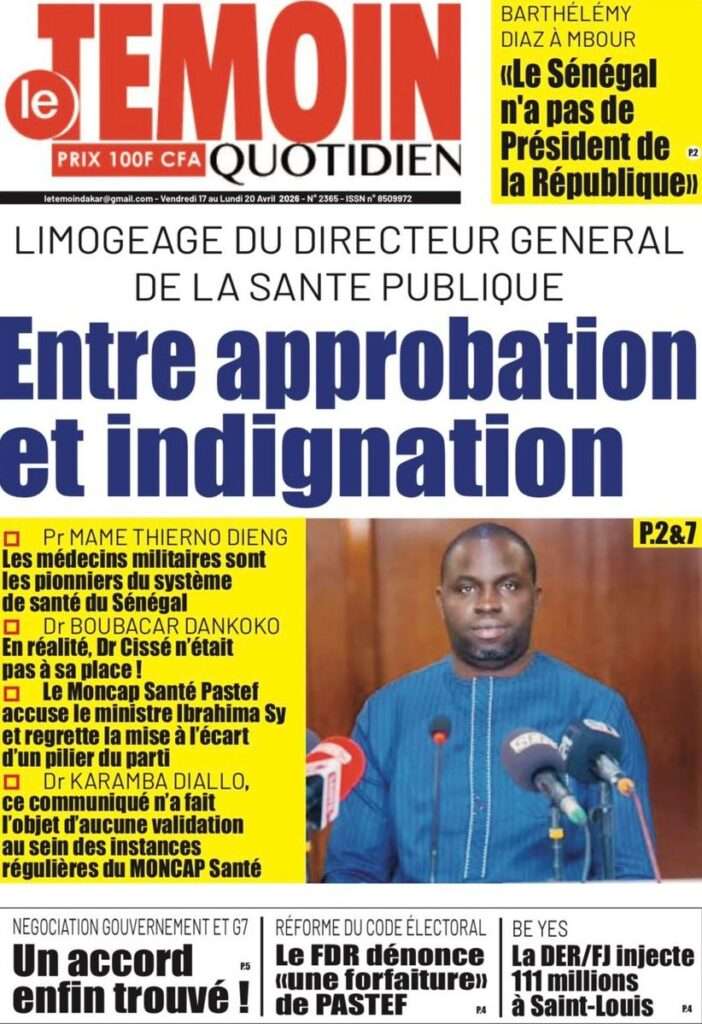 A la Une Actualité La Une Des Quotidiens – Vendredi 17 Avril 2026 (Avec Ma Revue De Presse) Bour Sine avril 17, 2026 0 Post navigation Previous: Négociations Enseignants-Gouvernement : un protocole d’accord signé, des points durs persistentNext: ÉPHÉMÉRIDES DU 17 AVRIL (Par Atoumane Mbaye) More Stories A la Une Actualité Politique Ce que change la nouvelle loi électorale adoptée par les députés Bour Sine avril 28, 2026 0 A la Une Actualité Politique « Ensemble, nous sommes une force »Par Hamidou Thiaw, Président du MPR Bour Sine avril 28, 2026 0 A la Une Actualité Pape Malick Ndour envoyé en prison Bour Sine avril 28, 2026 0 Laisser un commentaire Annuler la réponseVotre adresse e-mail ne sera pas publiée. Les champs obligatoires sont indiqués avec *Commentaire * Nom * E-mail * Site web Enregistrer mon nom, mon e-mail et mon site dans le navigateur pour mon prochain commentaire.