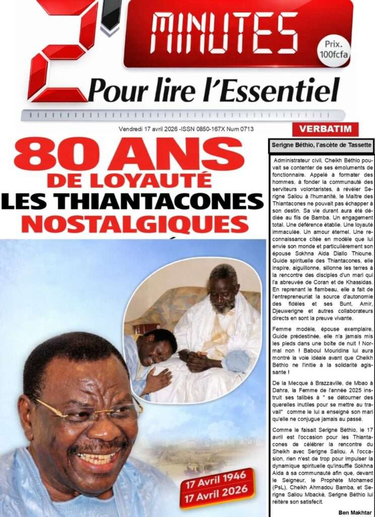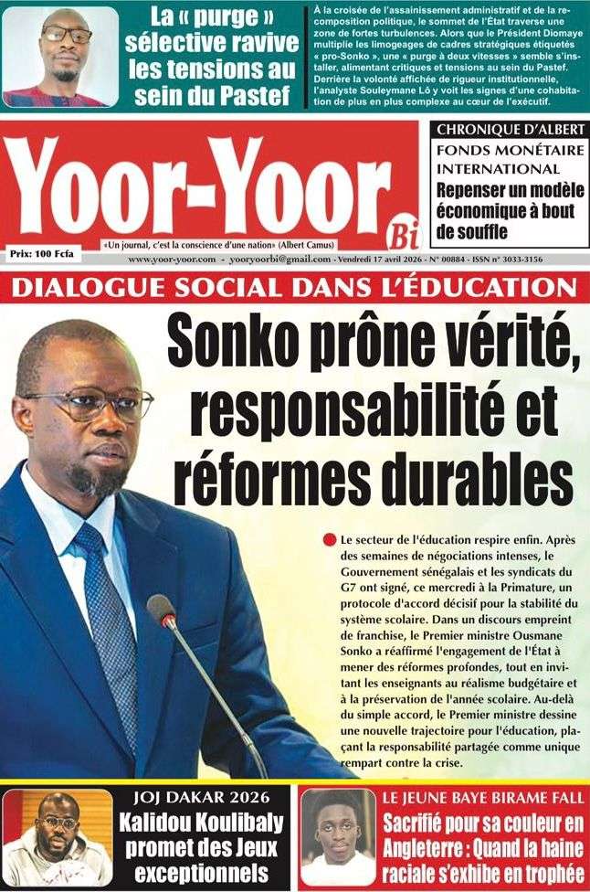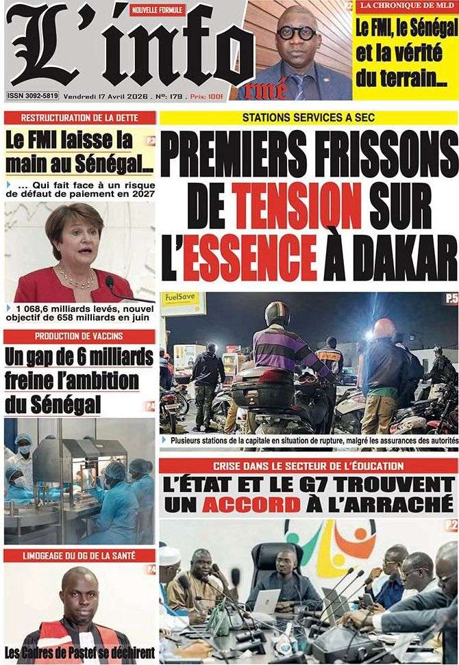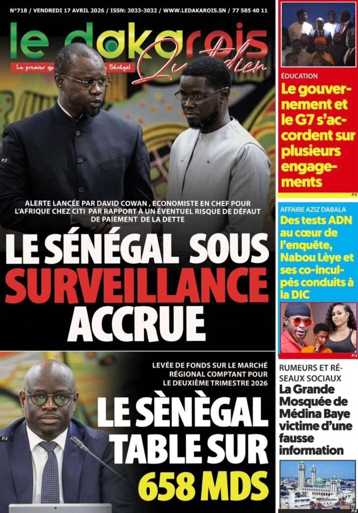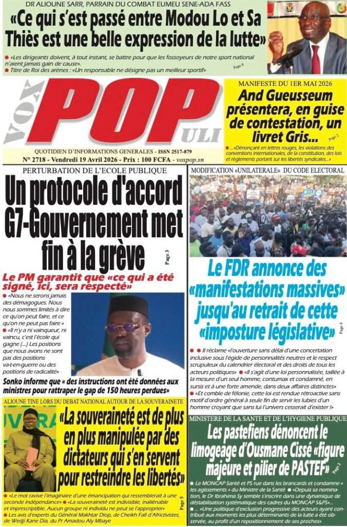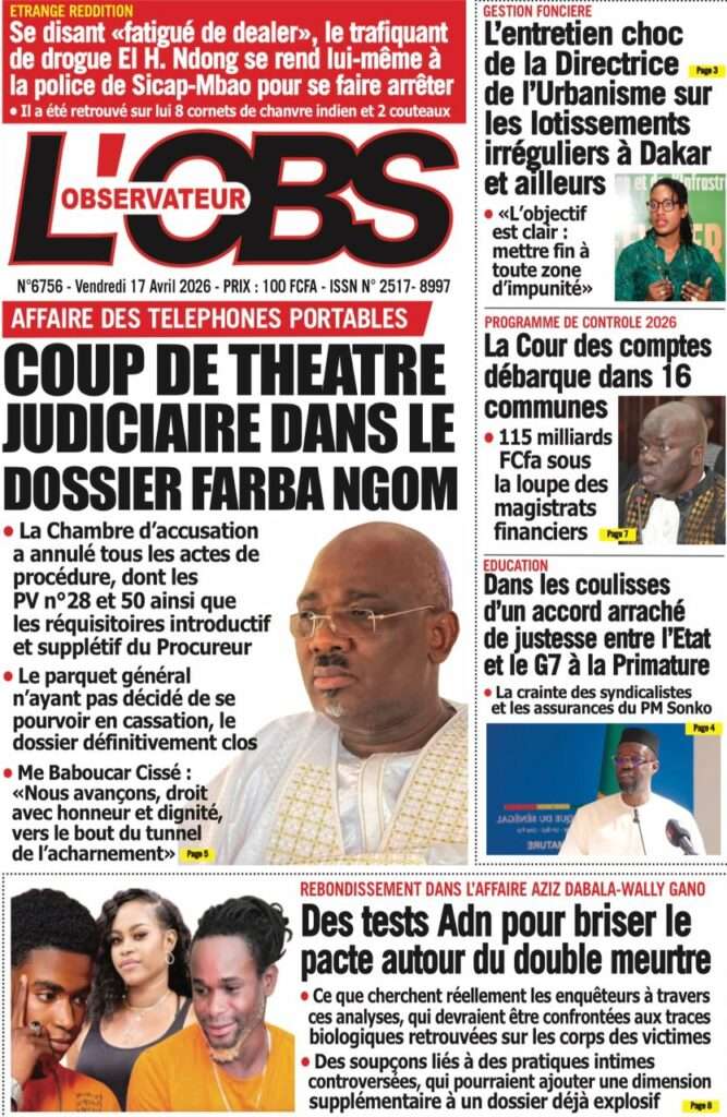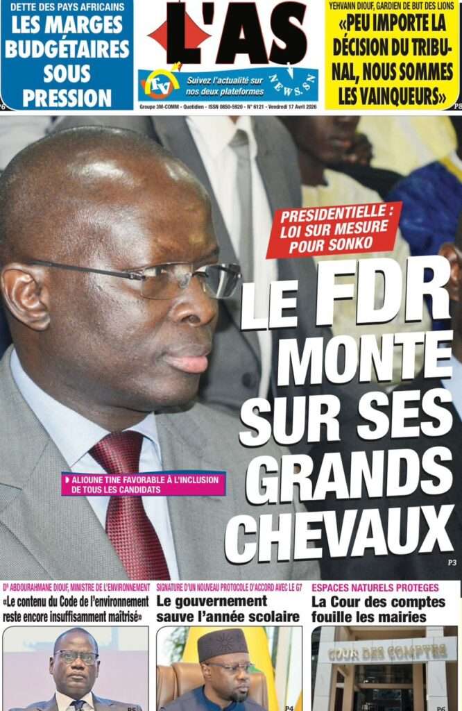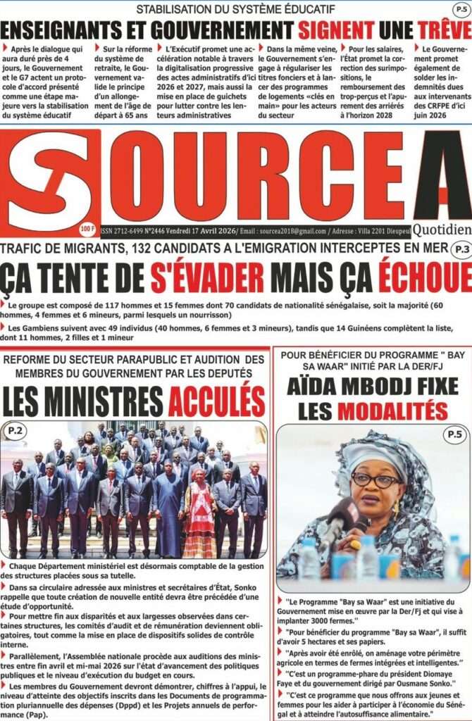 A la Une Actualité La Une Des Quotidiens – Vendredi 17 Avril 2026 (Avec Ma Revue De Presse) Bour Sine avril 17, 2026 0 Post navigation Previous: Négociations Enseignants-Gouvernement : un protocole d’accord signé, des points durs persistentNext: ÉPHÉMÉRIDES DU 17 AVRIL (Par Atoumane Mbaye) More Stories A la Une Actualité Politique Ce que change la nouvelle loi électorale adoptée par les députés Bour Sine avril 28, 2026 0 A la Une Actualité Politique « Ensemble, nous sommes une force »Par Hamidou Thiaw, Président du MPR Bour Sine avril 28, 2026 0 A la Une Actualité Pape Malick Ndour envoyé en prison Bour Sine avril 28, 2026 0 Laisser un commentaire Annuler la réponseVotre adresse e-mail ne sera pas publiée. Les champs obligatoires sont indiqués avec *Commentaire * Nom * E-mail * Site web Enregistrer mon nom, mon e-mail et mon site dans le navigateur pour mon prochain commentaire.