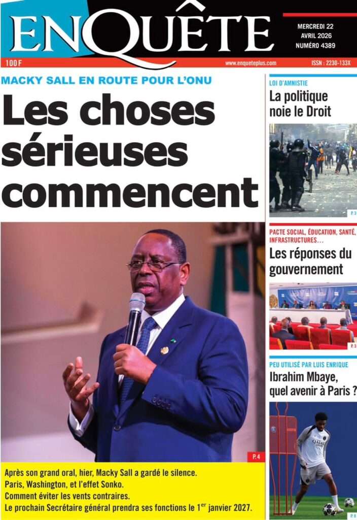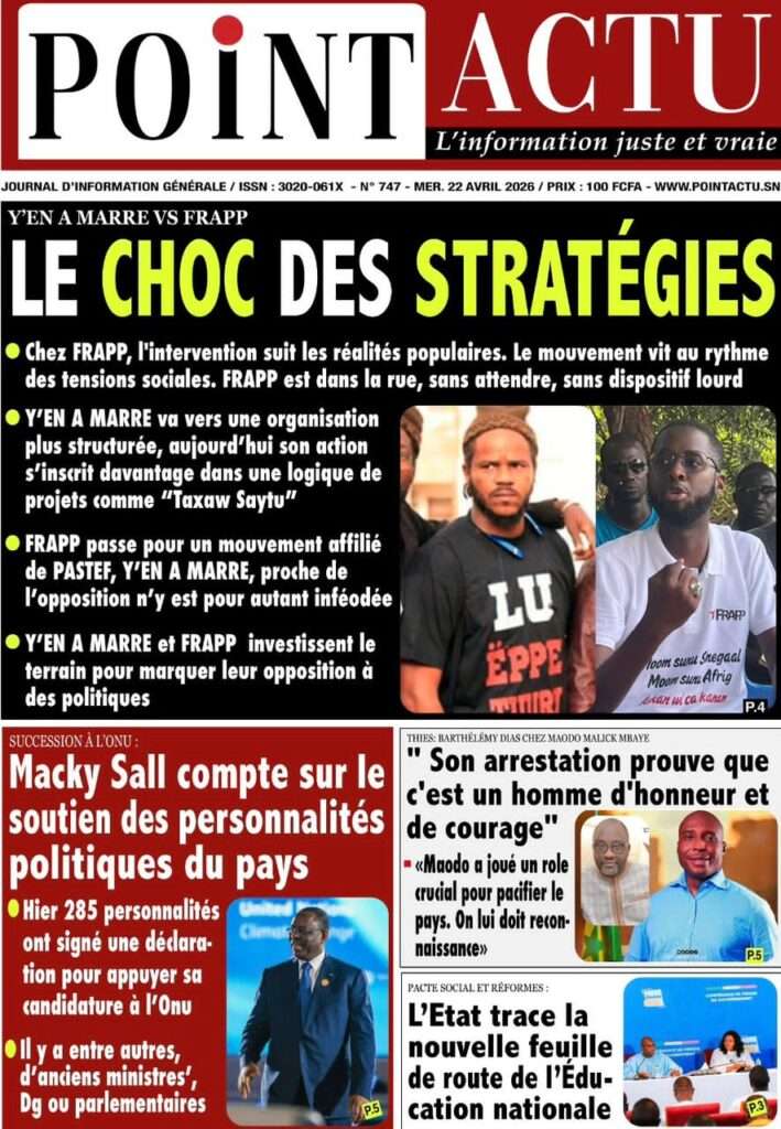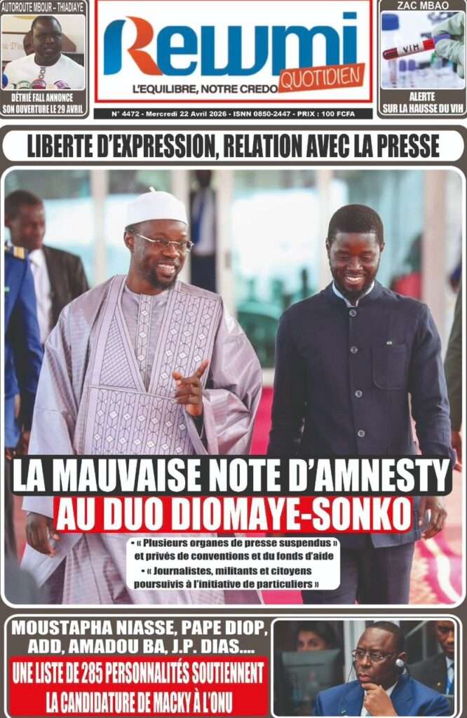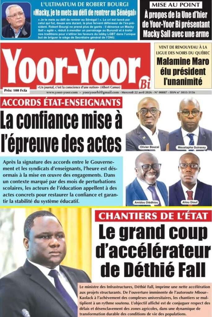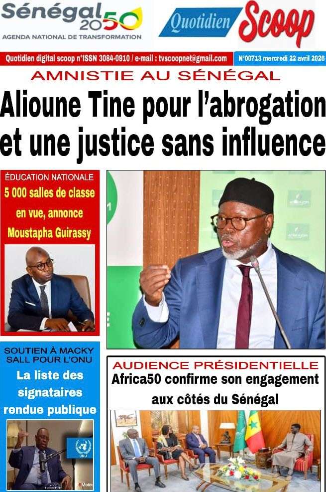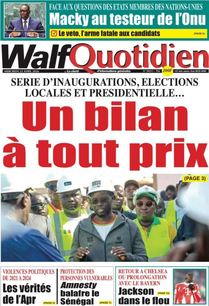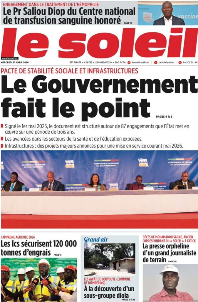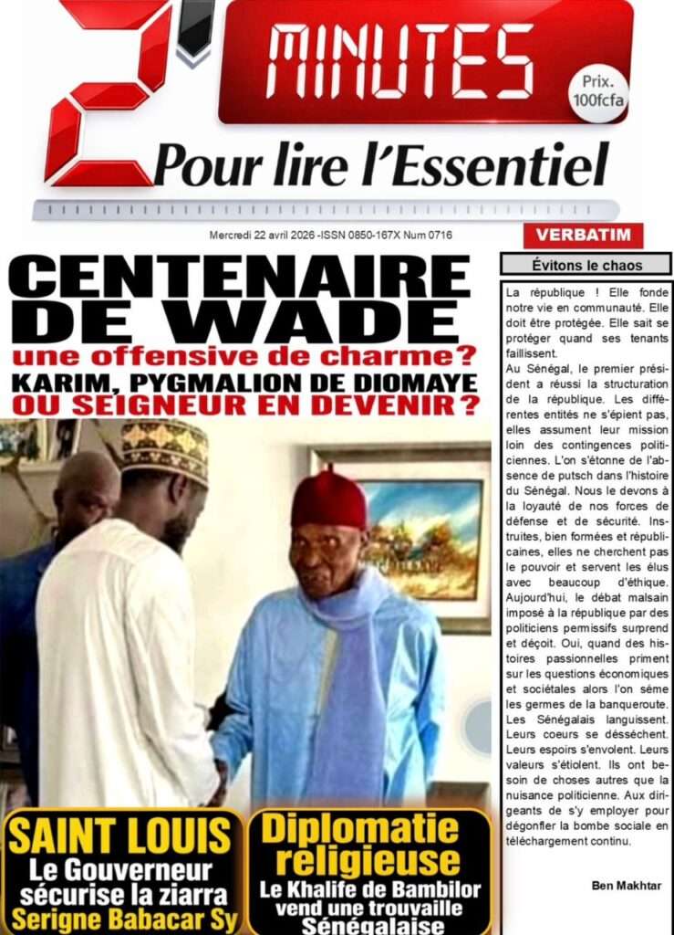 A la Une Actualité La Une Des Quotidiens – Mercredi 22 Avril 2026 (Avec Ma Revue De Presse) Bour Sine avril 22, 2026 0 Post navigation Previous: La “réalité du pouvoir” en Afrique : vérité ou alibi ?Next: Ephémérides du 22 avril (Source: SenegalDates) More Stories A la Une Actualité Politique Ce que change la nouvelle loi électorale adoptée par les députés Bour Sine avril 28, 2026 0 A la Une Actualité Politique « Ensemble, nous sommes une force »Par Hamidou Thiaw, Président du MPR Bour Sine avril 28, 2026 0 A la Une Actualité Pape Malick Ndour envoyé en prison Bour Sine avril 28, 2026 0 Laisser un commentaire Annuler la réponseVotre adresse e-mail ne sera pas publiée. Les champs obligatoires sont indiqués avec *Commentaire * Nom * E-mail * Site web Enregistrer mon nom, mon e-mail et mon site dans le navigateur pour mon prochain commentaire.