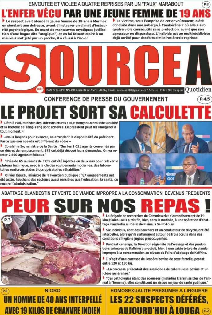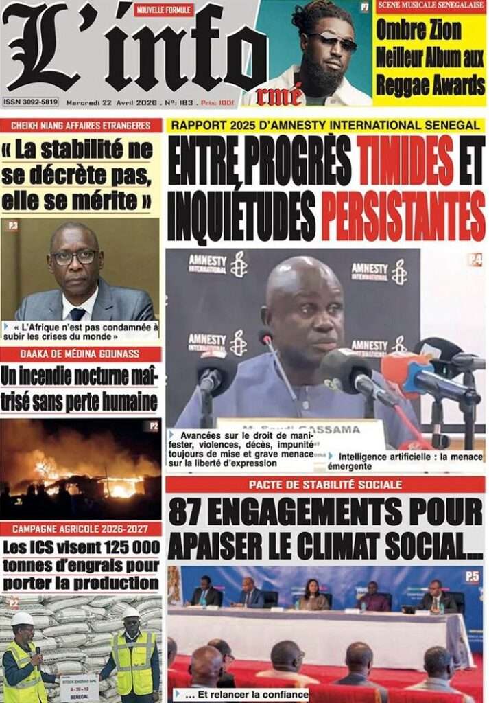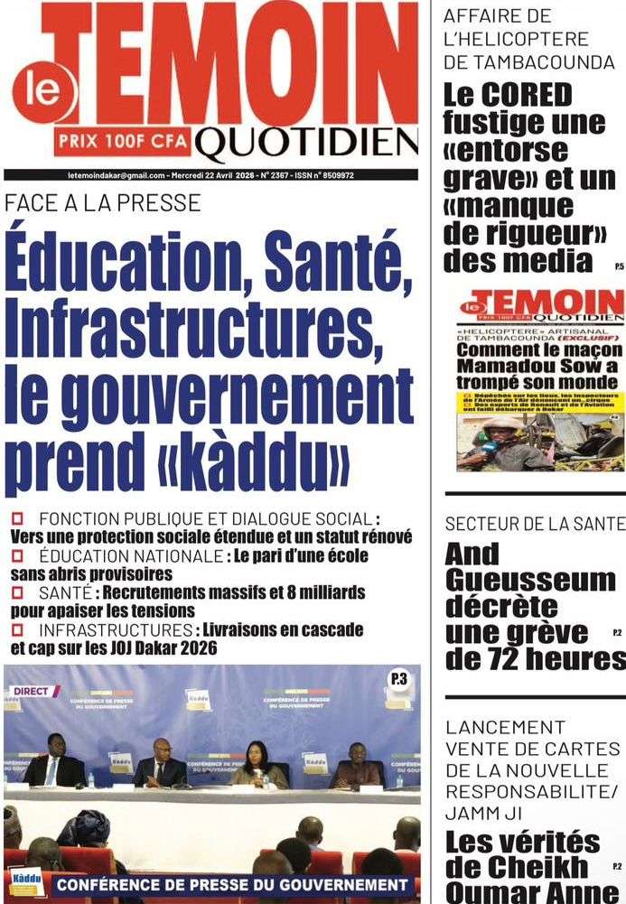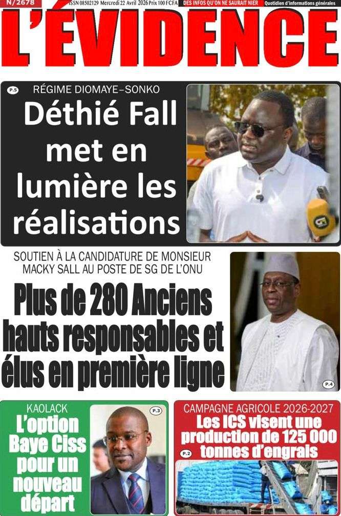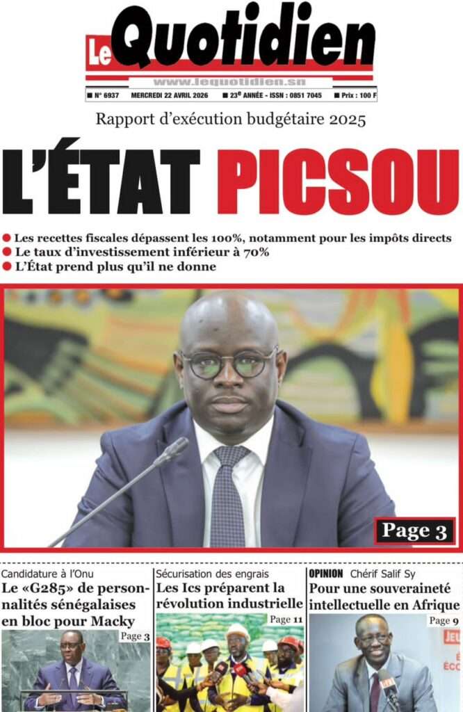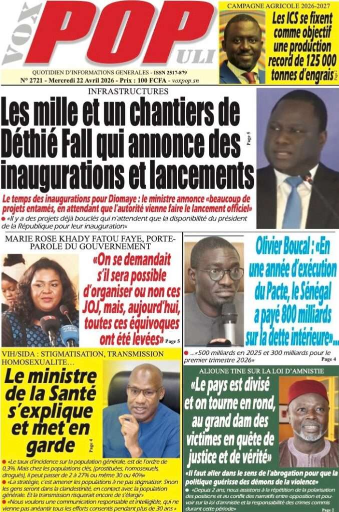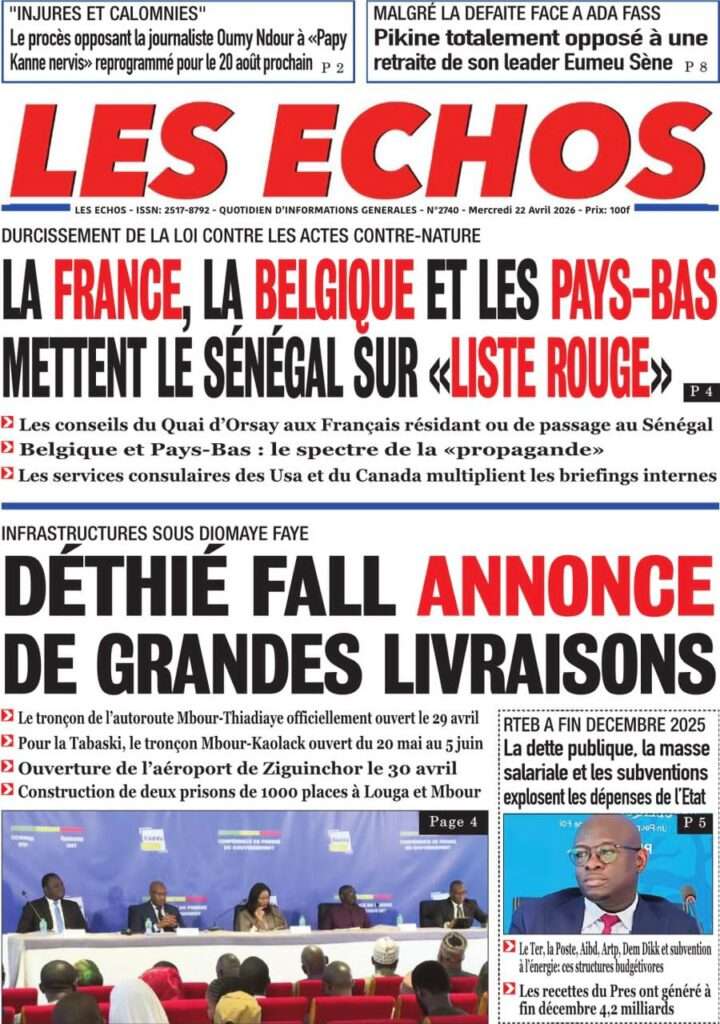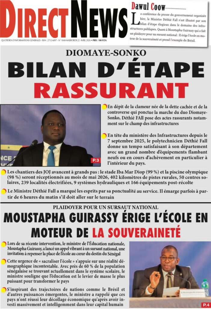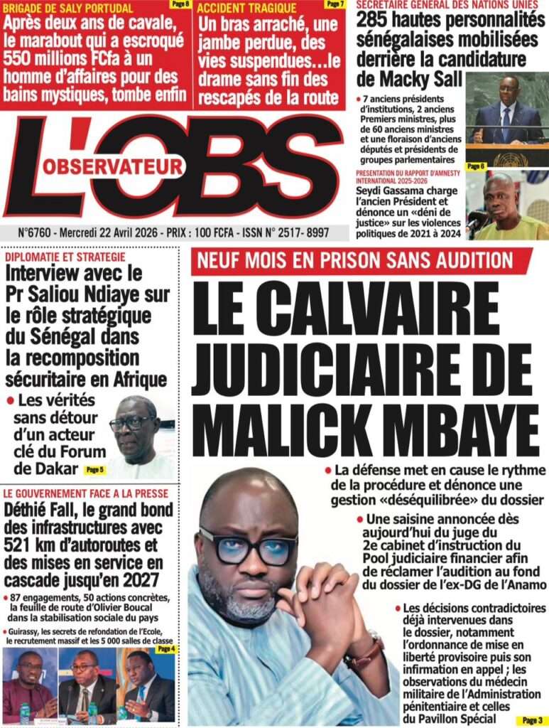 A la Une Actualité La Une Des Quotidiens – Mercredi 22 Avril 2026 (Avec Ma Revue De Presse) Bour Sine avril 22, 2026 0 Post navigation Previous: La “réalité du pouvoir” en Afrique : vérité ou alibi ?Next: Ephémérides du 22 avril (Source: SenegalDates) More Stories A la Une Actualité Politique Ce que change la nouvelle loi électorale adoptée par les députés Bour Sine avril 28, 2026 0 A la Une Actualité Politique « Ensemble, nous sommes une force »Par Hamidou Thiaw, Président du MPR Bour Sine avril 28, 2026 0 A la Une Actualité Pape Malick Ndour envoyé en prison Bour Sine avril 28, 2026 0 Laisser un commentaire Annuler la réponseVotre adresse e-mail ne sera pas publiée. Les champs obligatoires sont indiqués avec *Commentaire * Nom * E-mail * Site web Enregistrer mon nom, mon e-mail et mon site dans le navigateur pour mon prochain commentaire.