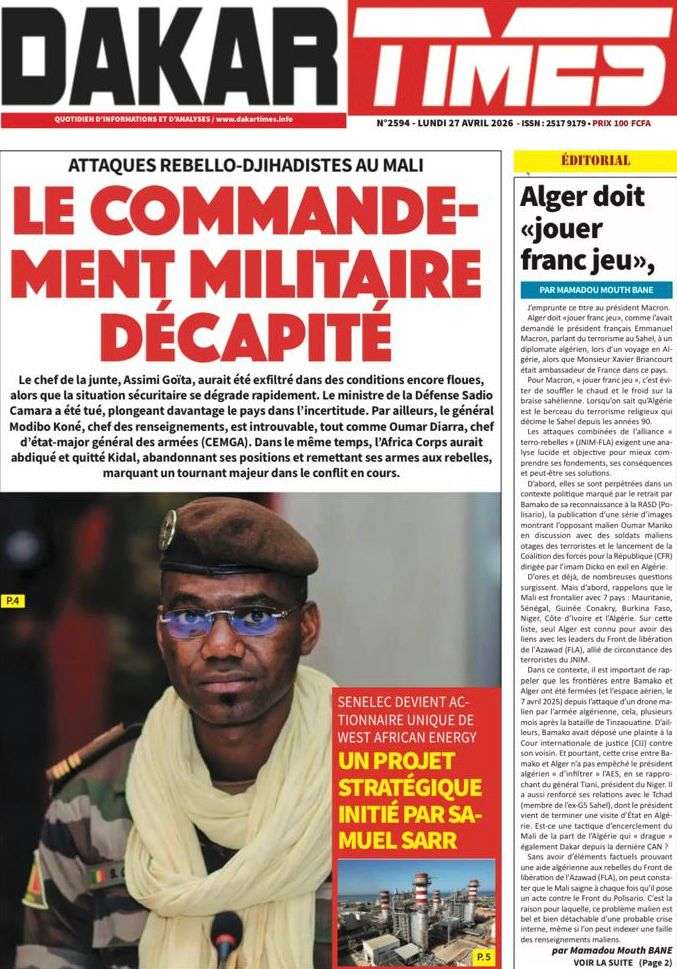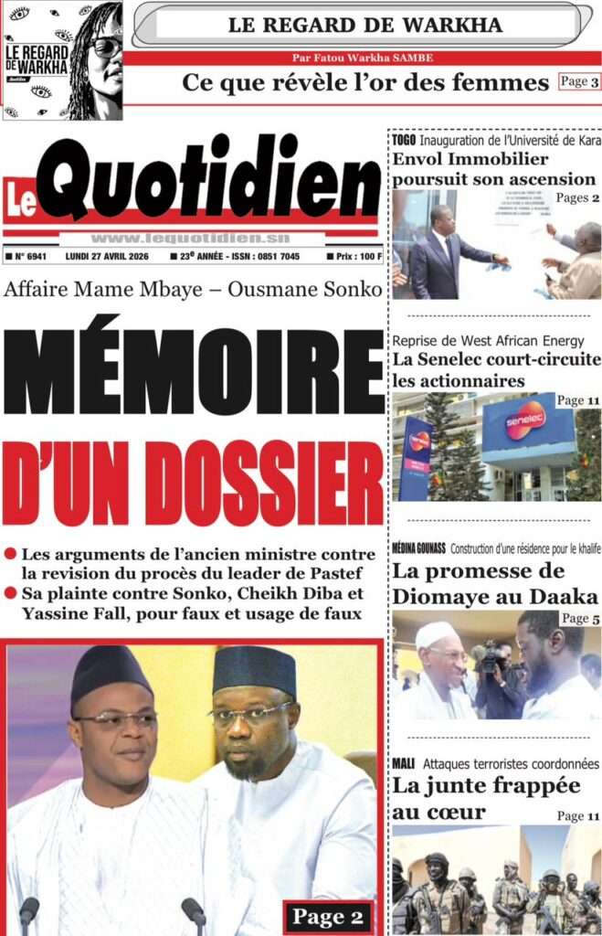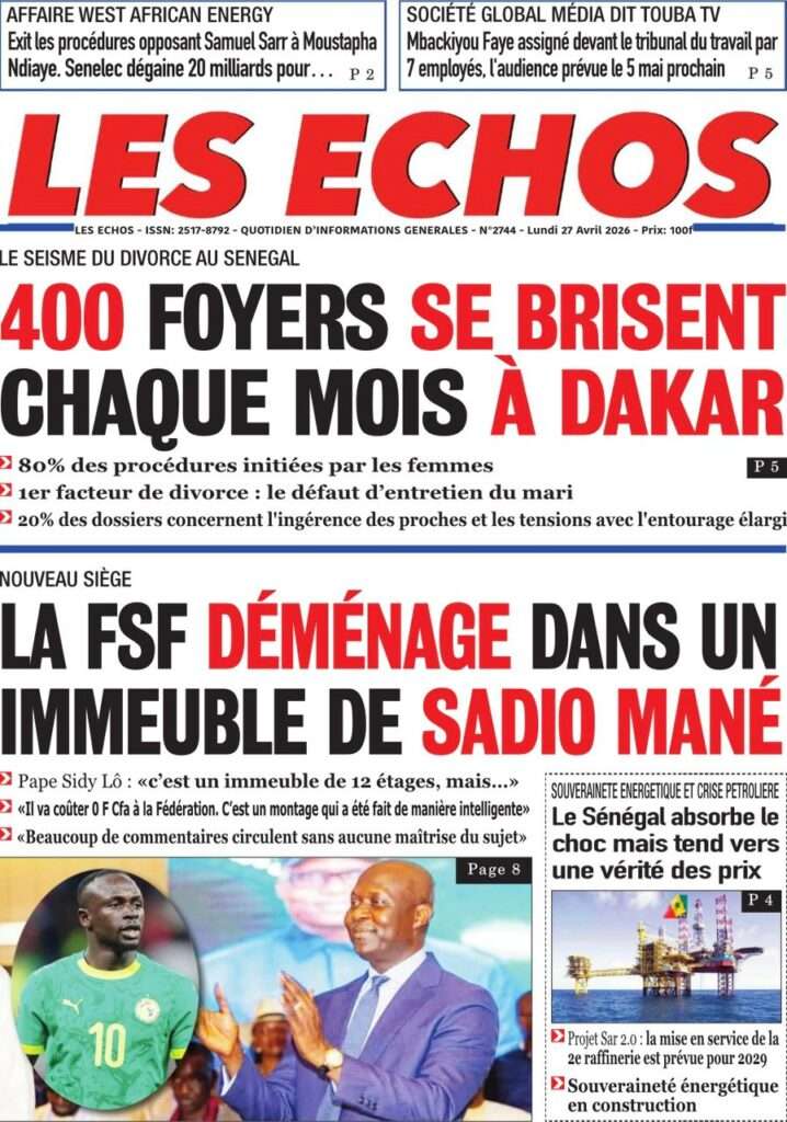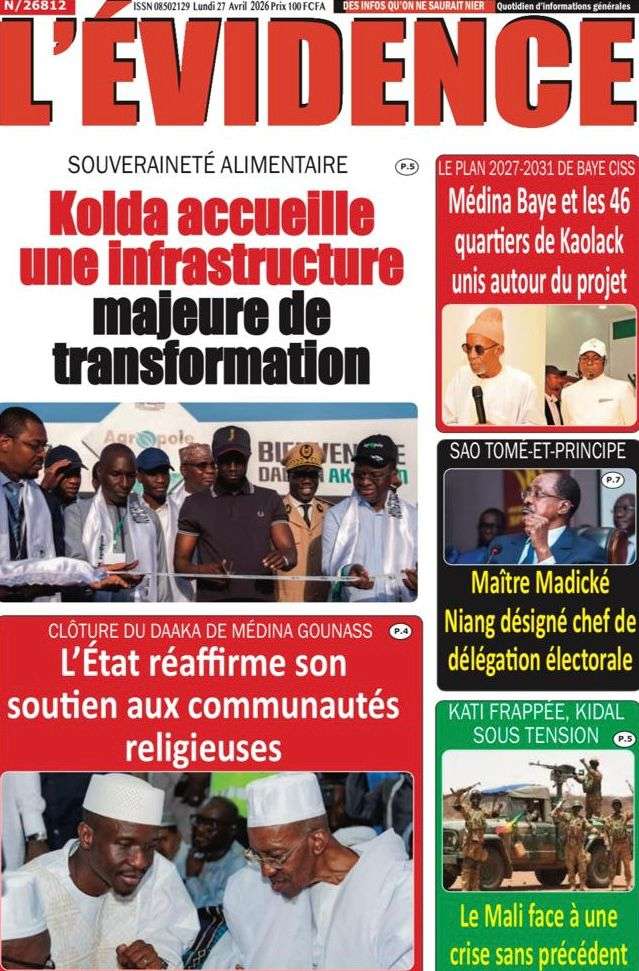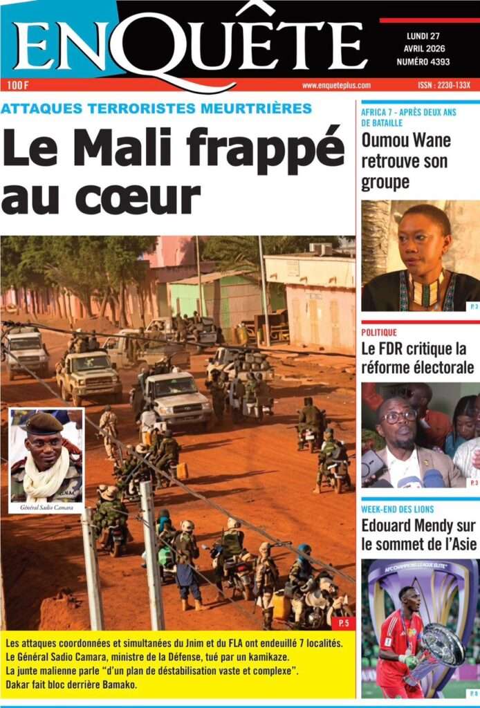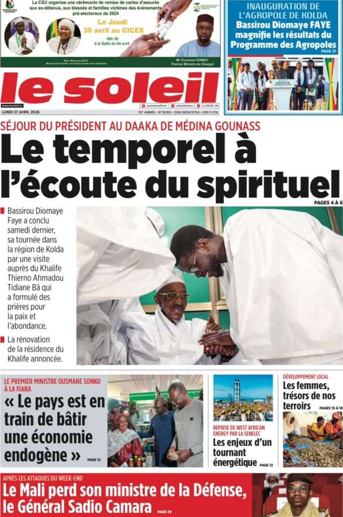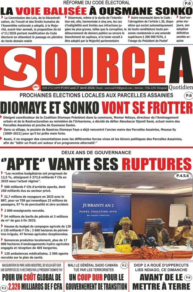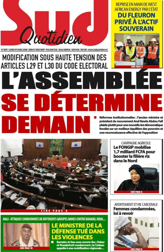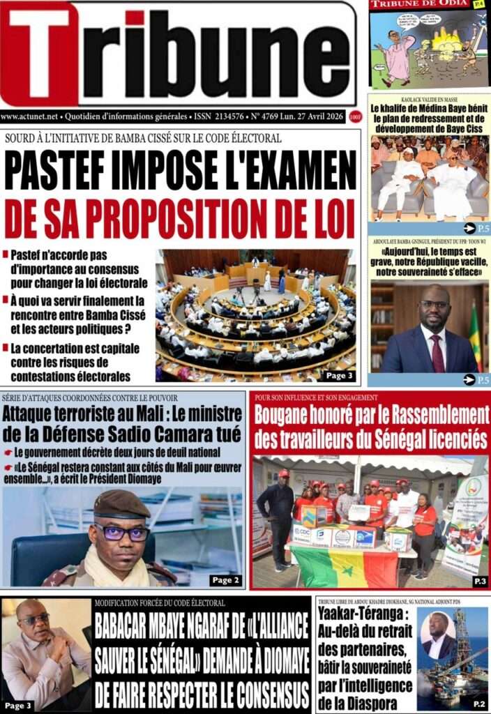 A la Une Actualité La Une Des Quotidiens – Lundi 27 Avril 2026 (Avec Ma Revue De Presse) Bour Sine avril 27, 2026 0 Post navigation Previous: Le ministre malien de la Défense, Sadio Camara, tué dans une attaque à KatiNext: Éphémérides du 27 avril (Par SenegalDates) More Stories A la Une Actualité Politique Ce que change la nouvelle loi électorale adoptée par les députés Bour Sine avril 28, 2026 0 A la Une Actualité Politique « Ensemble, nous sommes une force »Par Hamidou Thiaw, Président du MPR Bour Sine avril 28, 2026 0 A la Une Actualité Pape Malick Ndour envoyé en prison Bour Sine avril 28, 2026 0 Laisser un commentaire Annuler la réponseVotre adresse e-mail ne sera pas publiée. Les champs obligatoires sont indiqués avec *Commentaire * Nom * E-mail * Site web Enregistrer mon nom, mon e-mail et mon site dans le navigateur pour mon prochain commentaire.